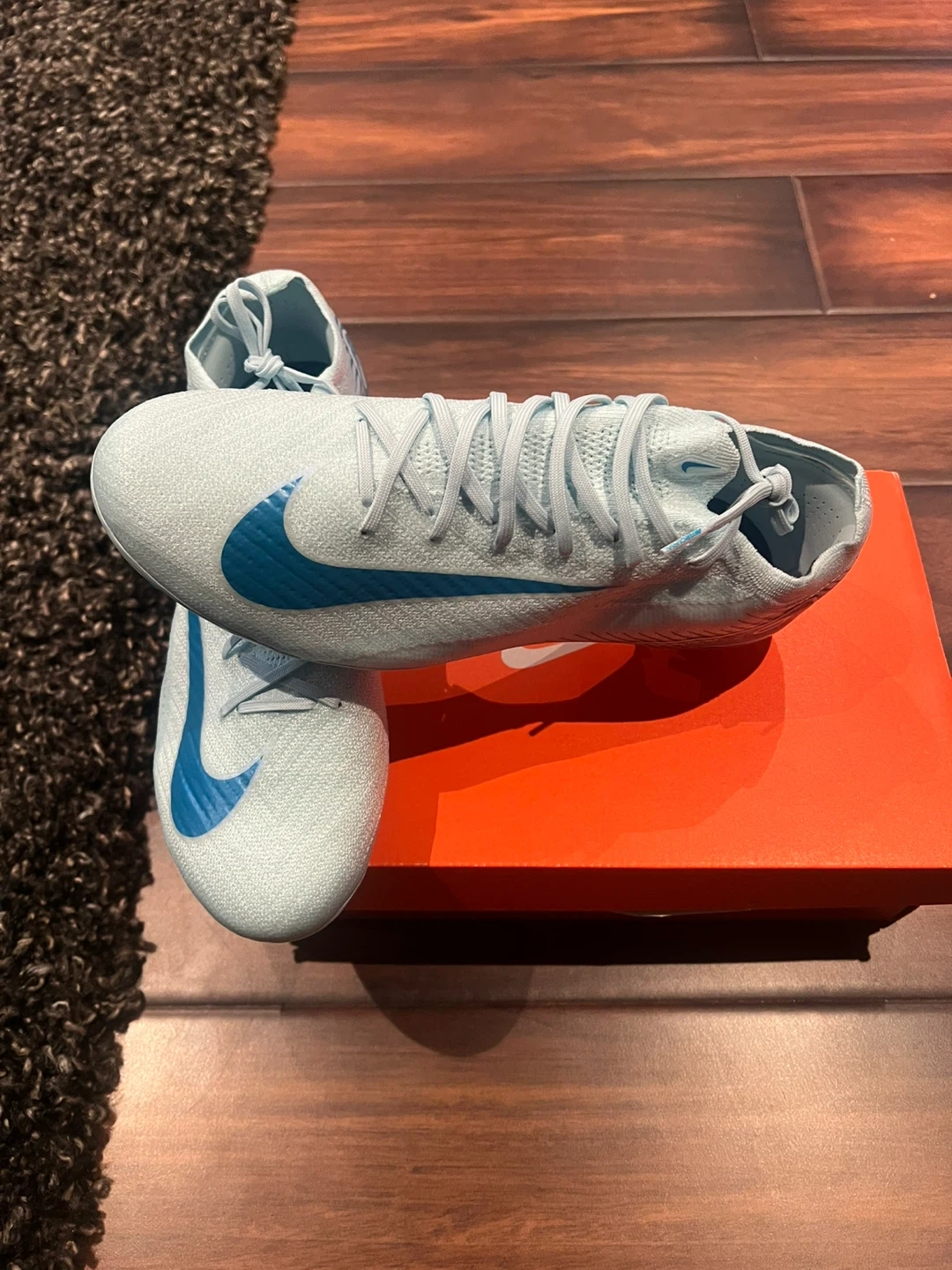 Light blue Nike Mercurial soccer cleats. These cleats have a lace-up closure and a synthetic material upper. Comes with the original box.