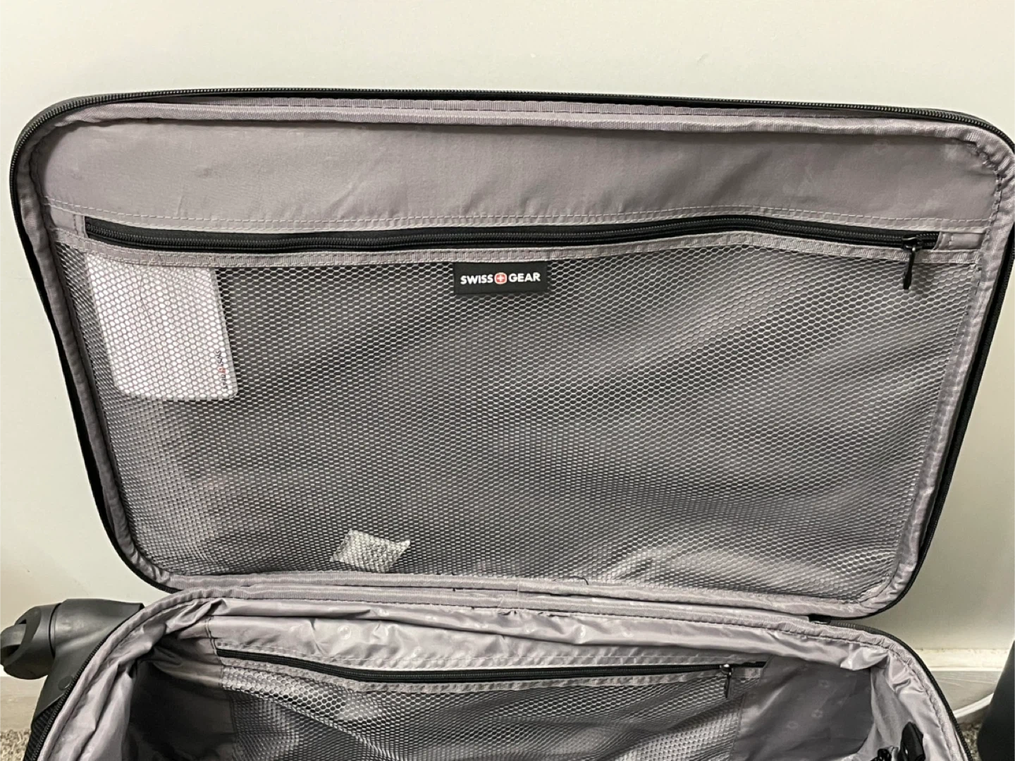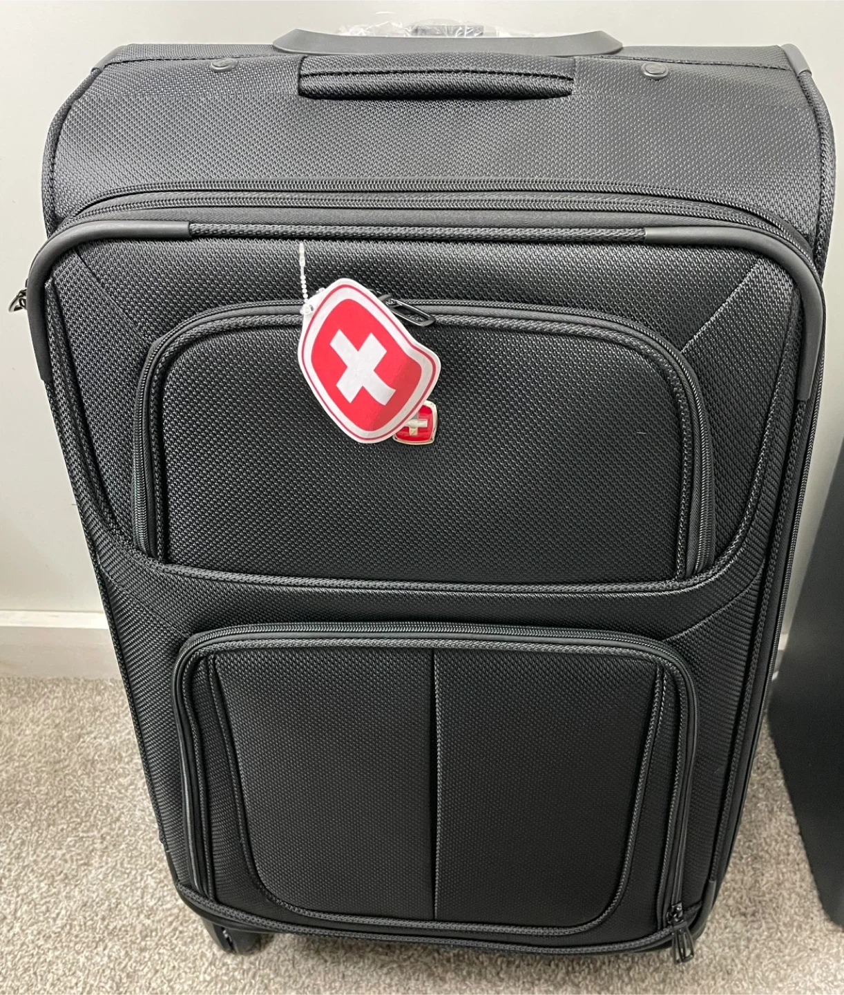 This is a black rolling suitcase from Swiss Gear. It's 25.5 inches tall. This luggage is ready for your next trip!