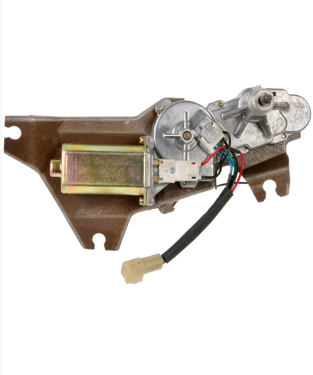 This is a windshield wiper motor assembly. It's a replacement part for vehicles. It includes the motor and mounting bracket.