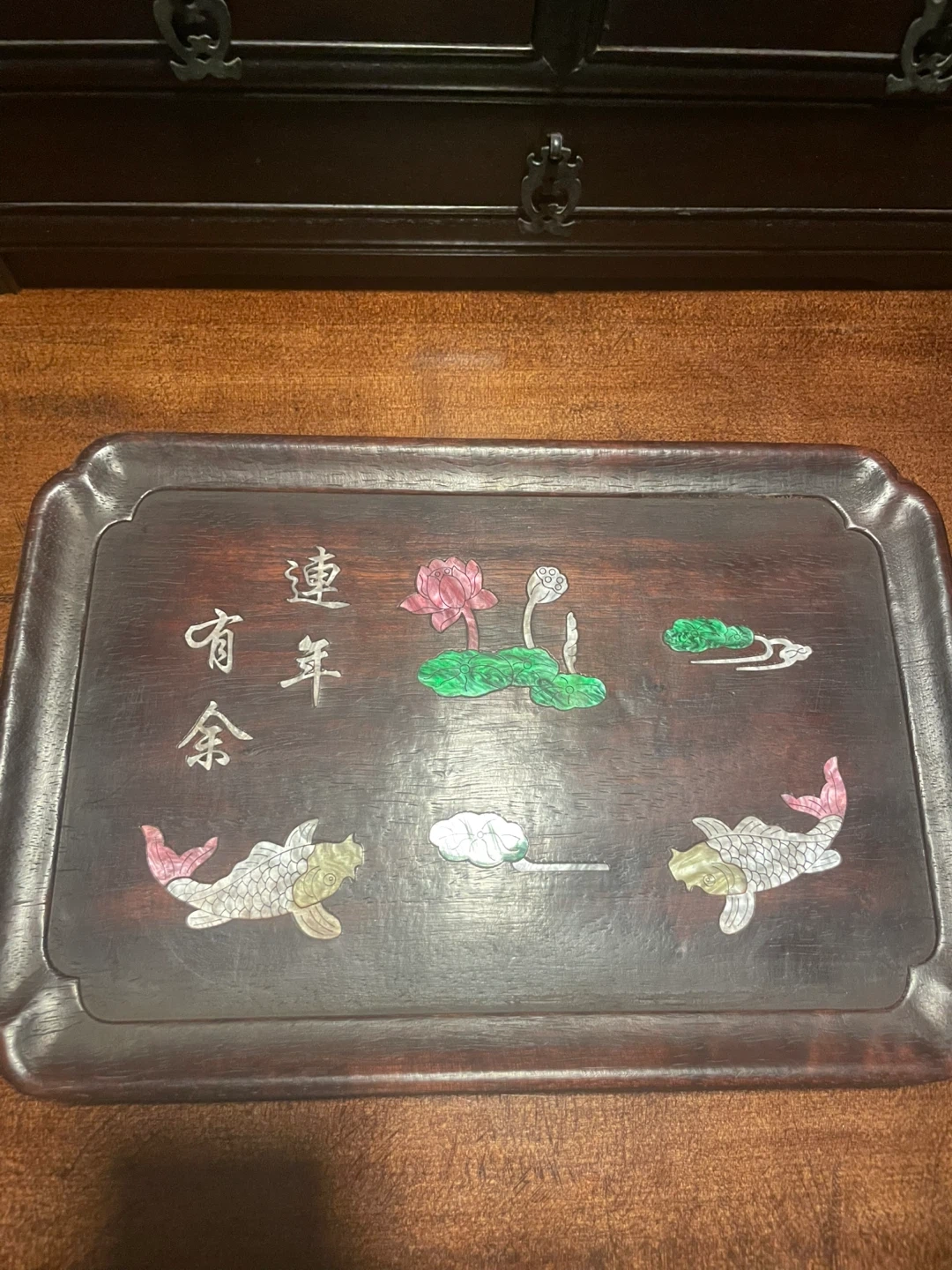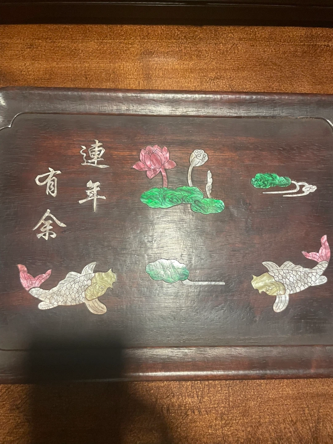 Decorative wooden tray featuring inlaid designs of koi fish, lotus flowers, and cloud motifs. It's made of dark wood with intricate shell or mother-of-pearl accents. This piece could serve as a unique display item or for serving small items.