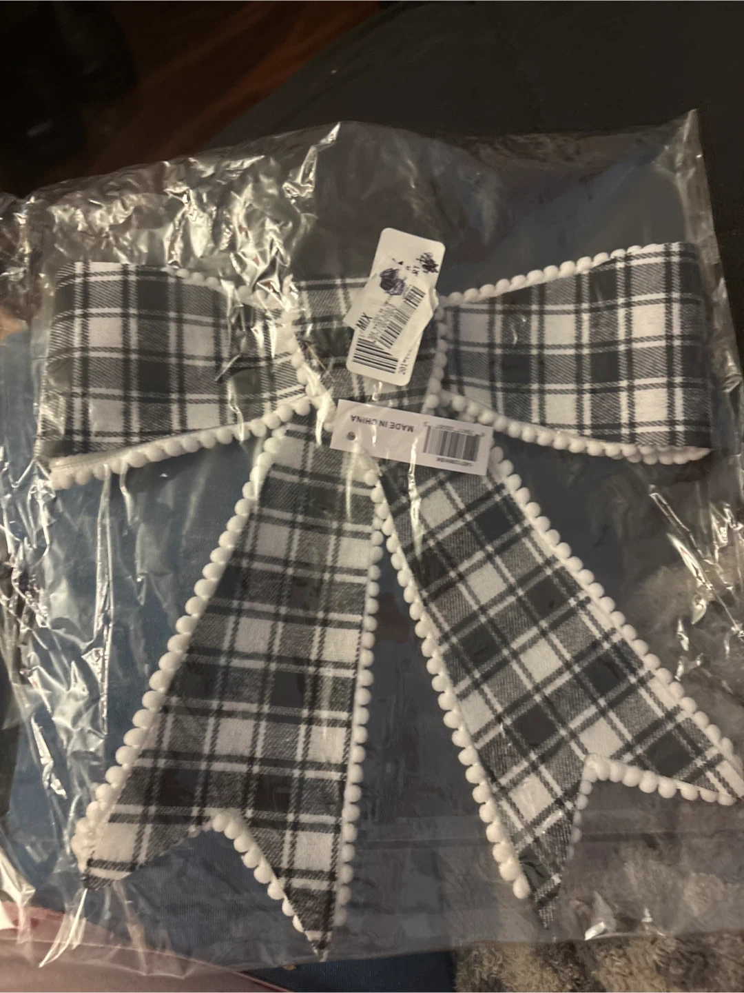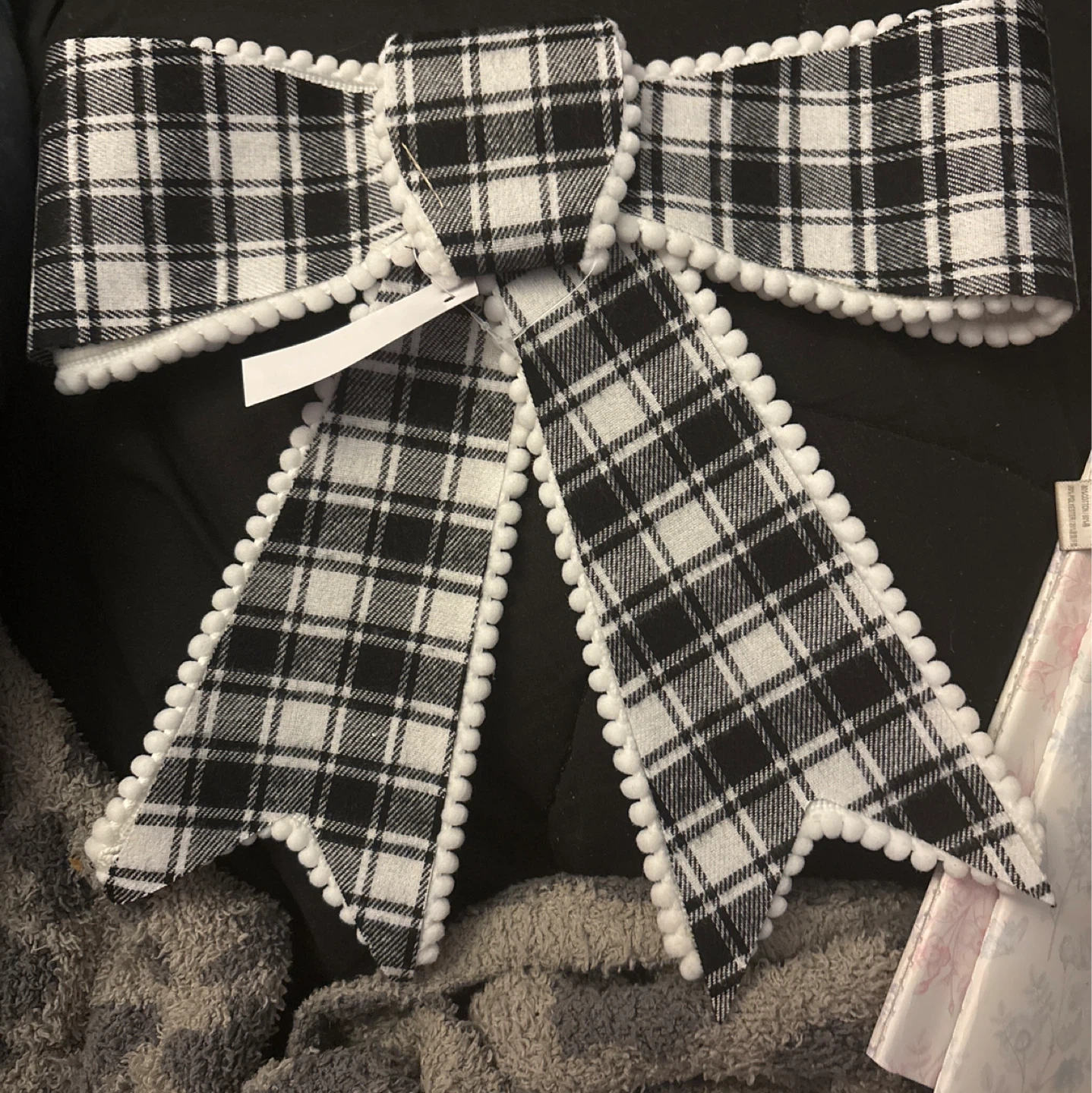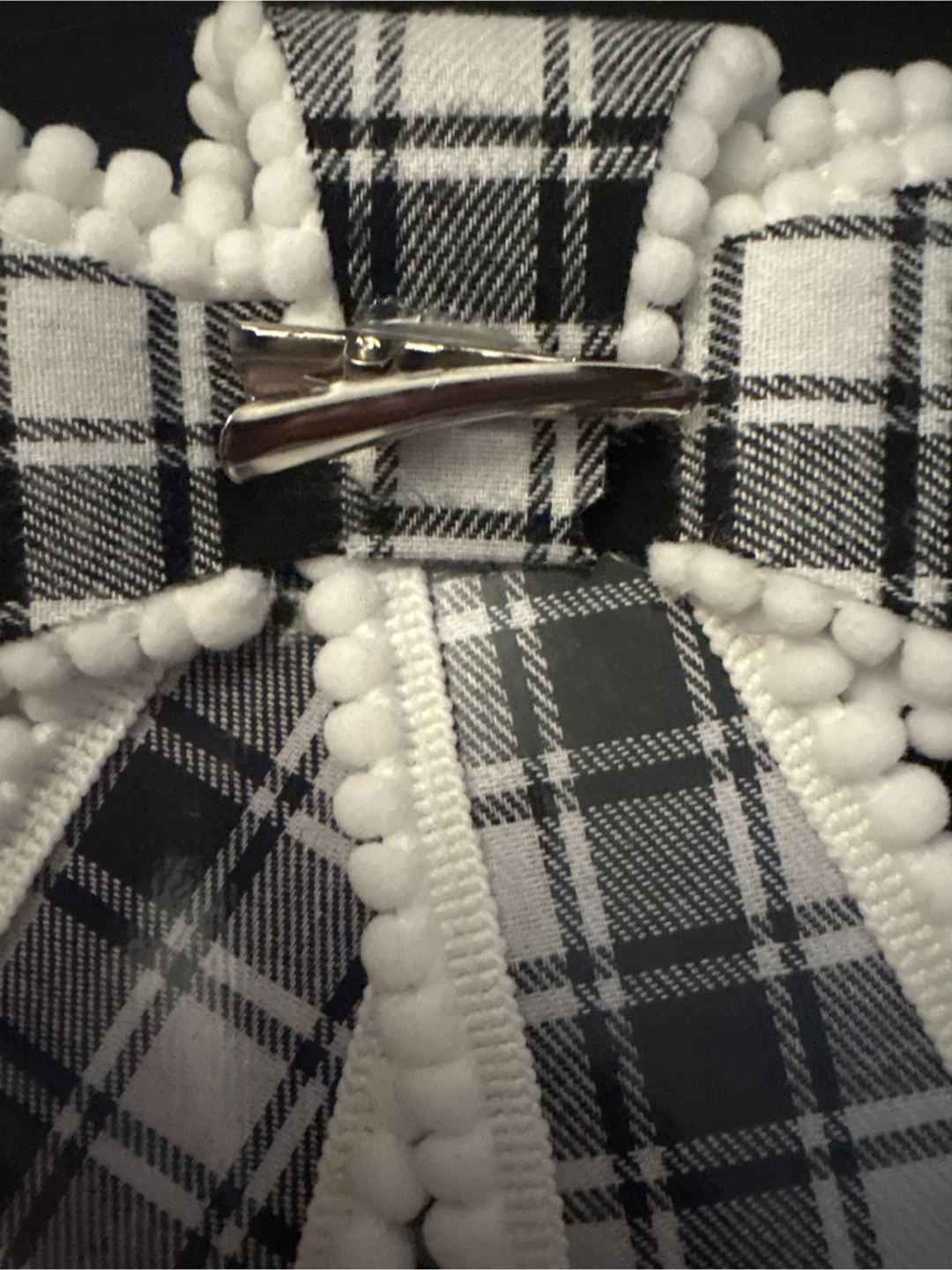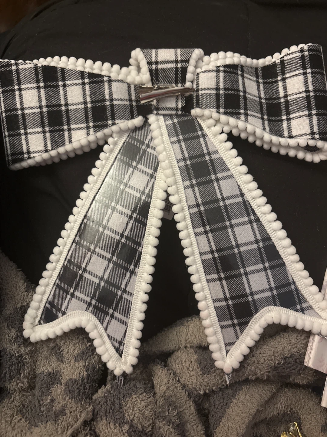 This is a cute plaid bow clip. It features a black and white checkered pattern with a white pom-pom trim. It's attached to a metal alligator clip. Perfect for adding a festive touch New