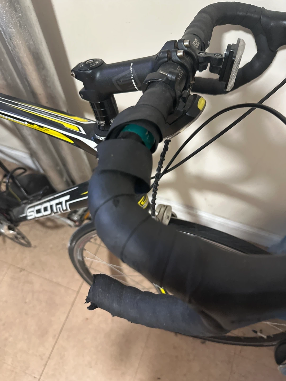 Scott road bike, black and yellow. It's a complete bicycle with handlebars, seat, and wheels. Small unwinding of the handle bars just due to heat in apartment an easy fix
