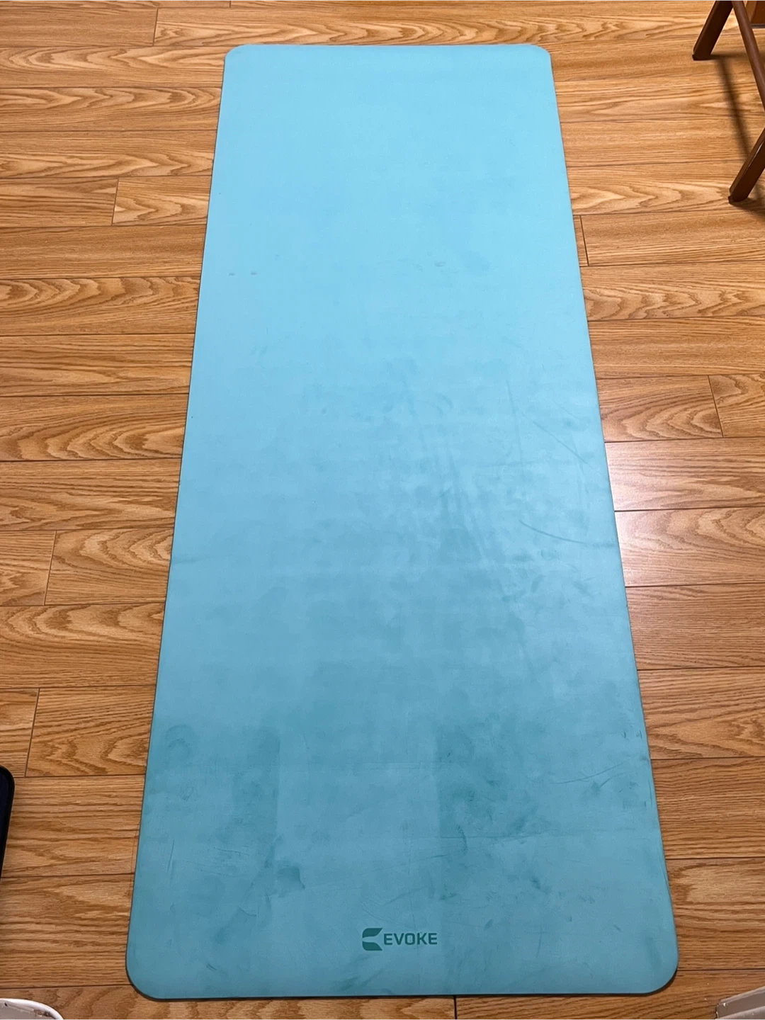 This is an Evoke yoga mat in a light blue colour. It's made of a durable material and provides good cushioning for your workouts. This mat is suitable for various fitness activities like yoga, Pilates, and stretching.
