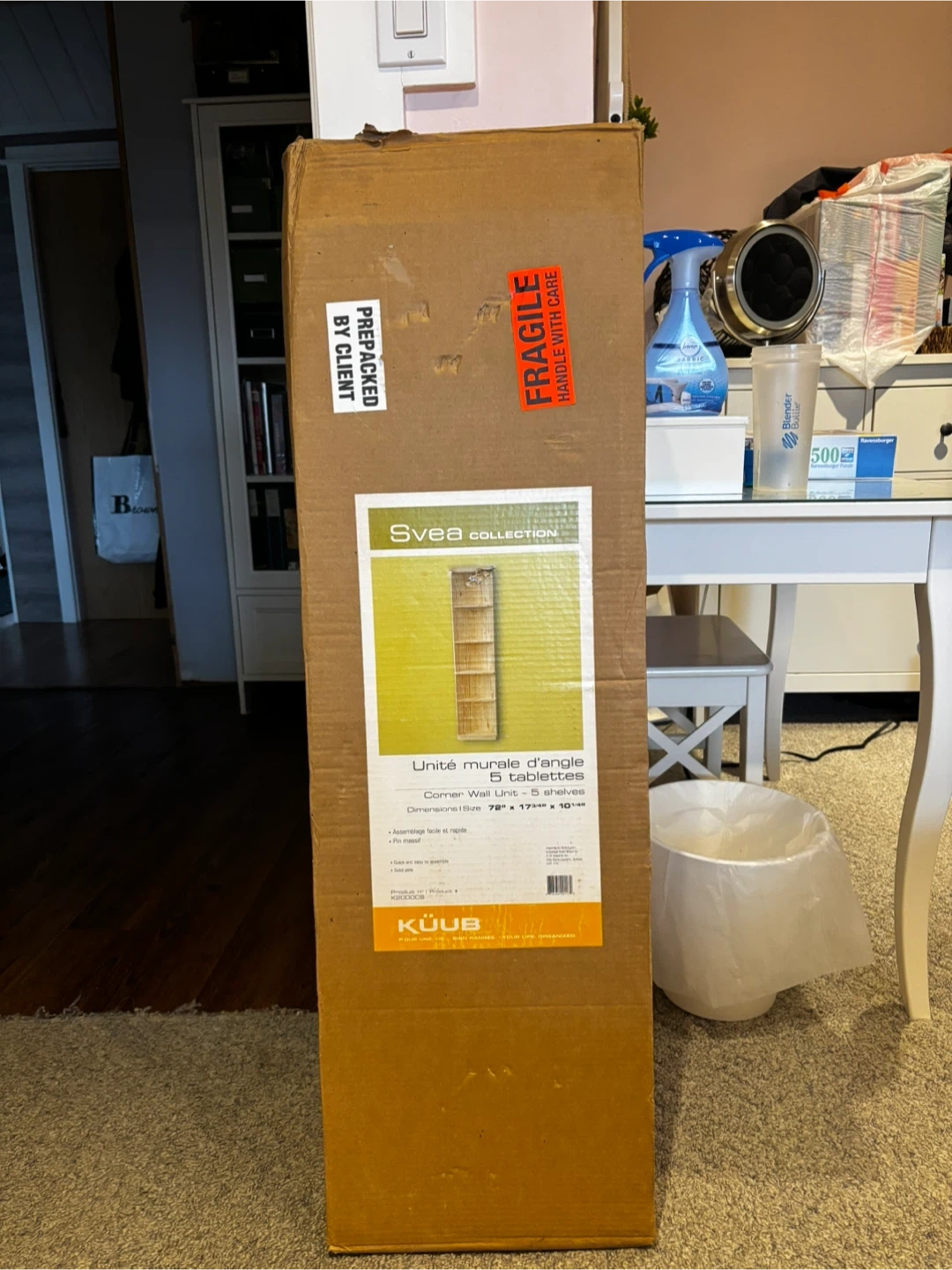 This Svea Collection corner wall unit comes with 5 shelves. It's made of solid pine. Dimensions are 72" x 17 ¾" x 10".