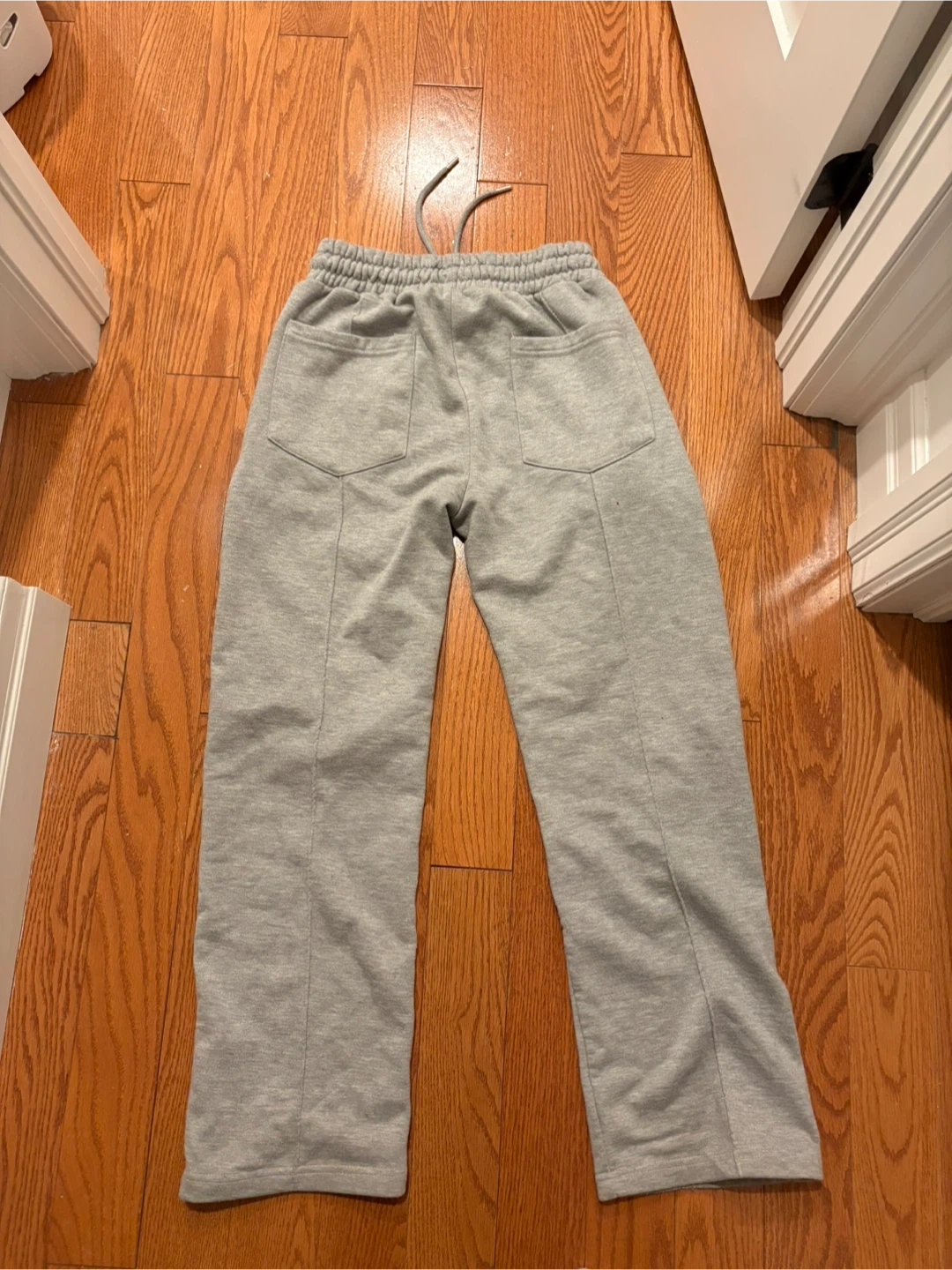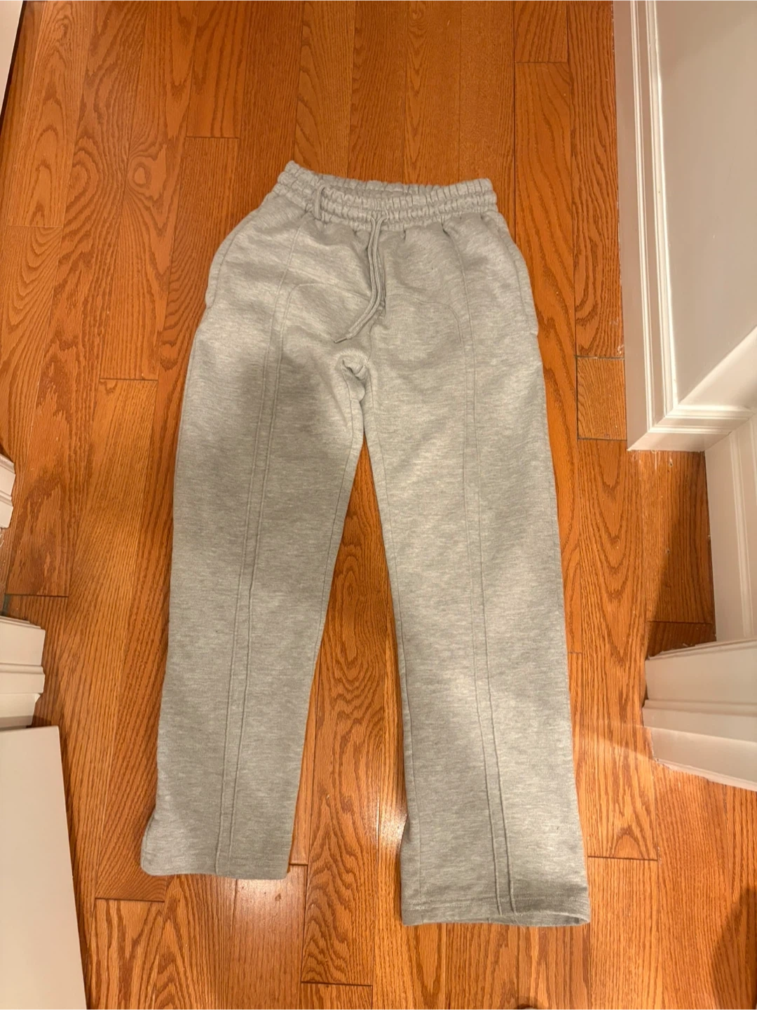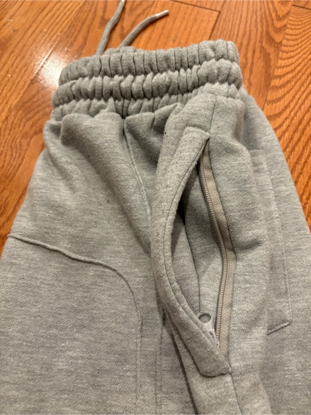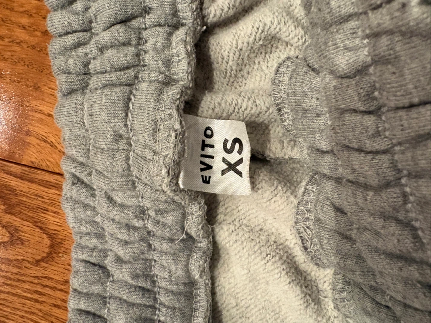 These are Evito grey sweatpants in size XS. They feature a drawstring waist and zippered pockets for secure storage. Made from a soft cotton blend for comfort.