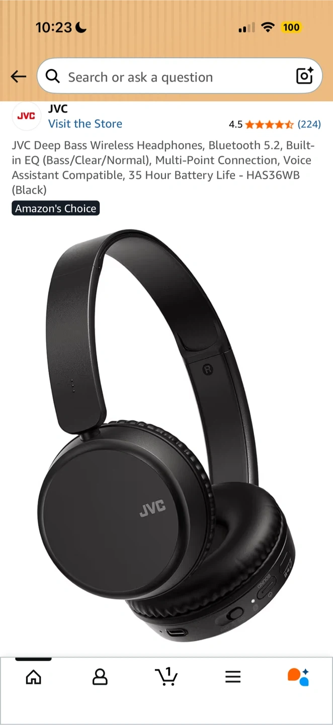 JVC Deep Bass Wireless Headphones with Bluetooth 5.2. Includes built-in EQ modes and multi-point connection. Offers 35 hours of battery life. These are black over-ear headphones.