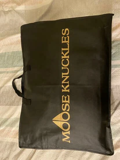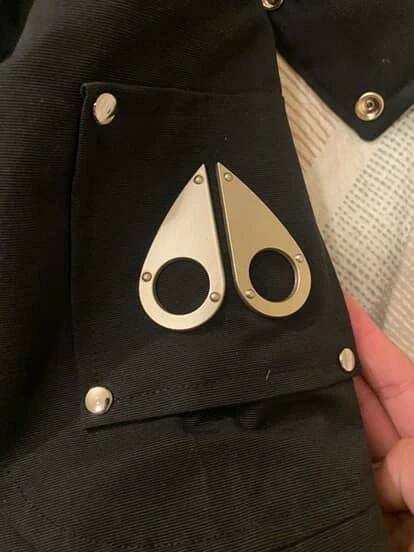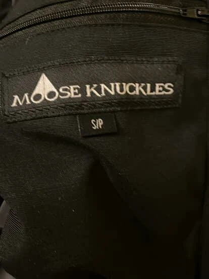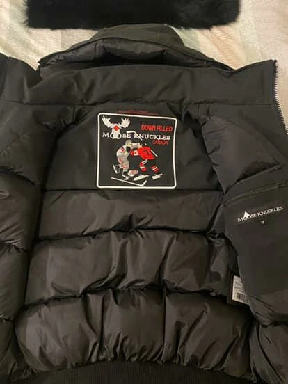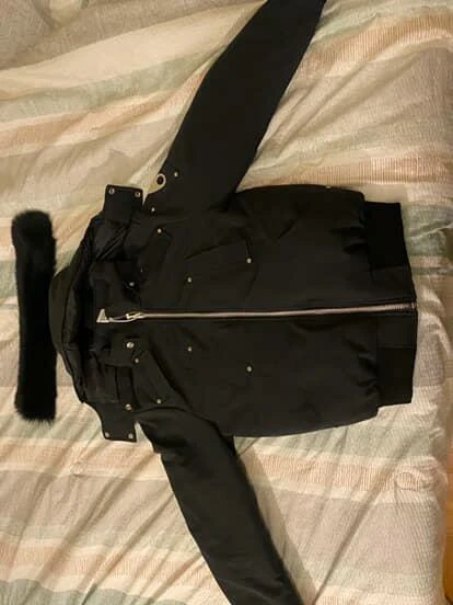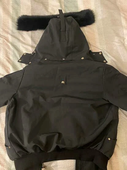 This black Moose Knuckles bomber jacket is down-filled for warmth. It's a size S/P. Features a fur-lined hood and the signature Moose Knuckles logo detailing. It's a really good 1:1