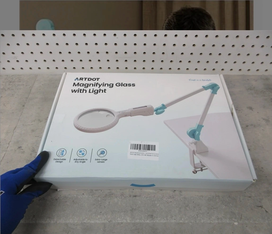 ARTDOT magnifying glass with an adjustable arm and light. Features extra-large lenses and a clamp base for secure attachment. It's designed for detailed work, making it easier to see small print or intricate projects.