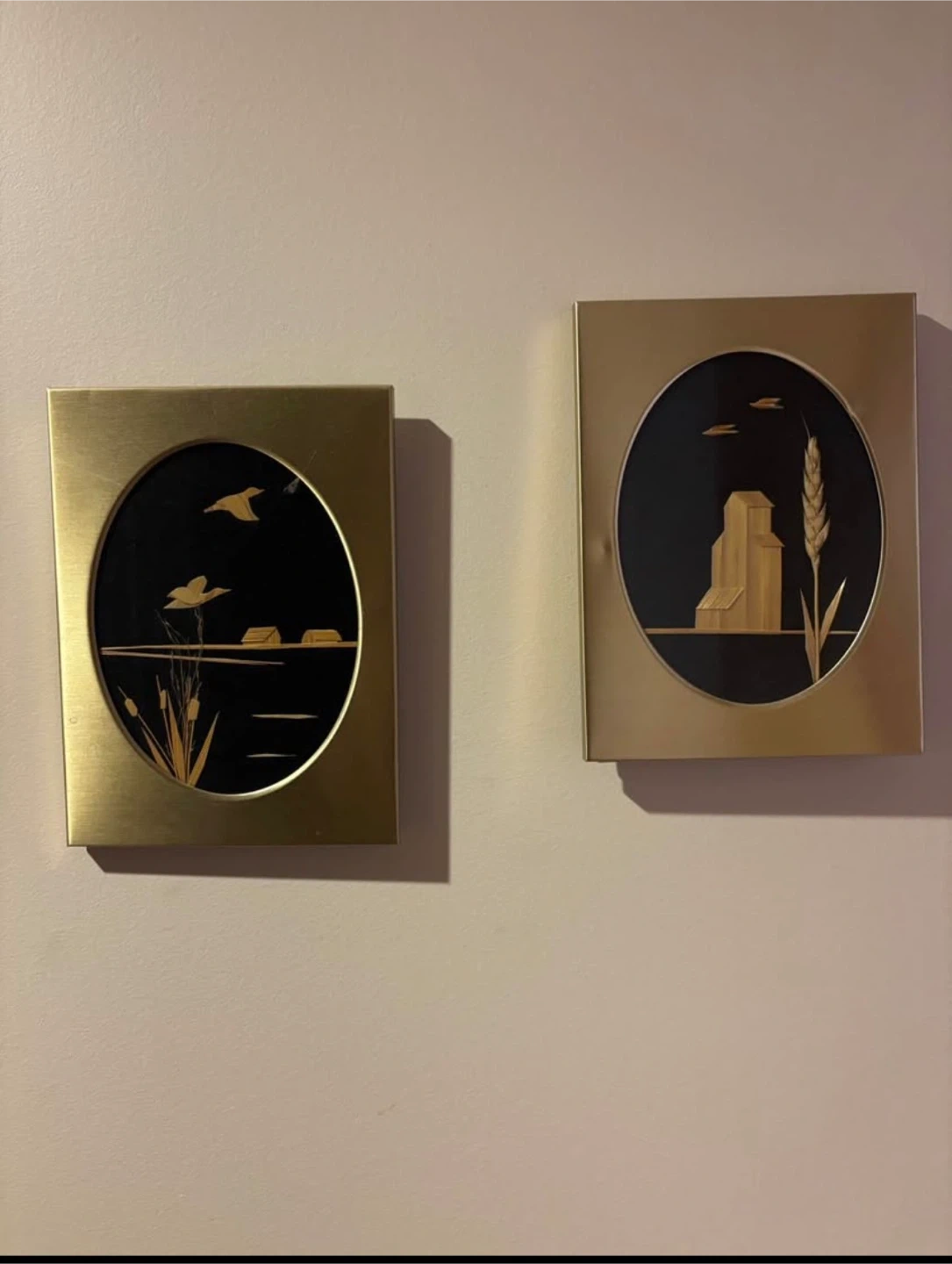 This set features two decorative wall art pieces with a farmhouse theme. Each piece has a gold-tone frame and depicts a scene with natural elements. One shows a marsh with birds, and the other a rural landscape with a silo and wheat stalk. They're a nice touch for any room!
