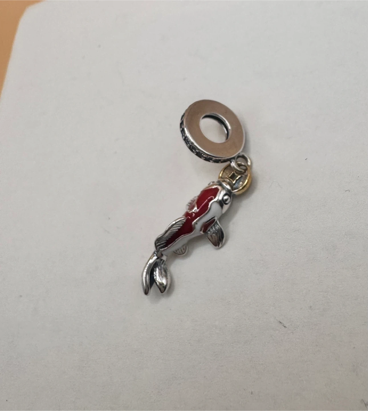 Sterling silver charm shaped like a red and white koi fish. It has a loop for attaching to a bracelet. S925 This charm is great for adding a unique touch to your jewellery collection.