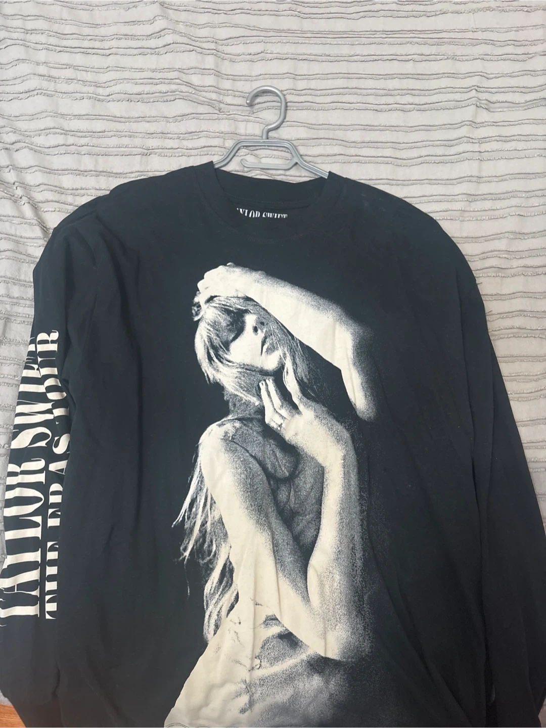 Selling a Taylor Swift The Eras Tour long sleeve shirt! It's black with a graphic of Taylor Swift on the front and "Taylor Swift The Eras Tour" printed on the sleeve. Great for any Swiftie!