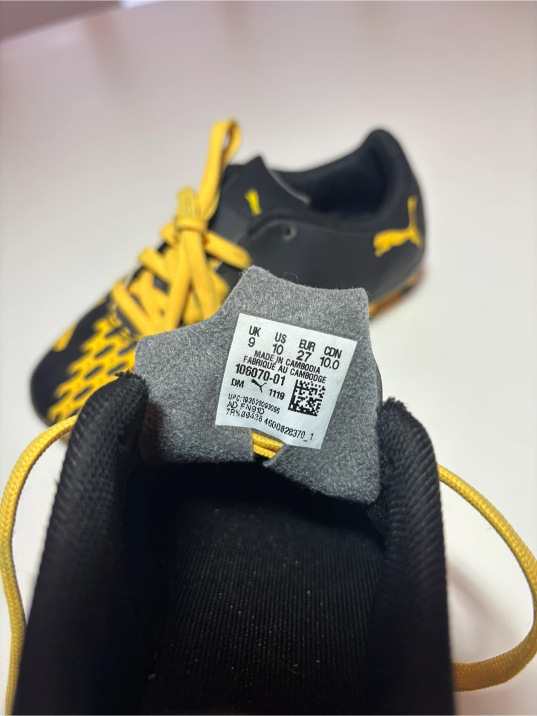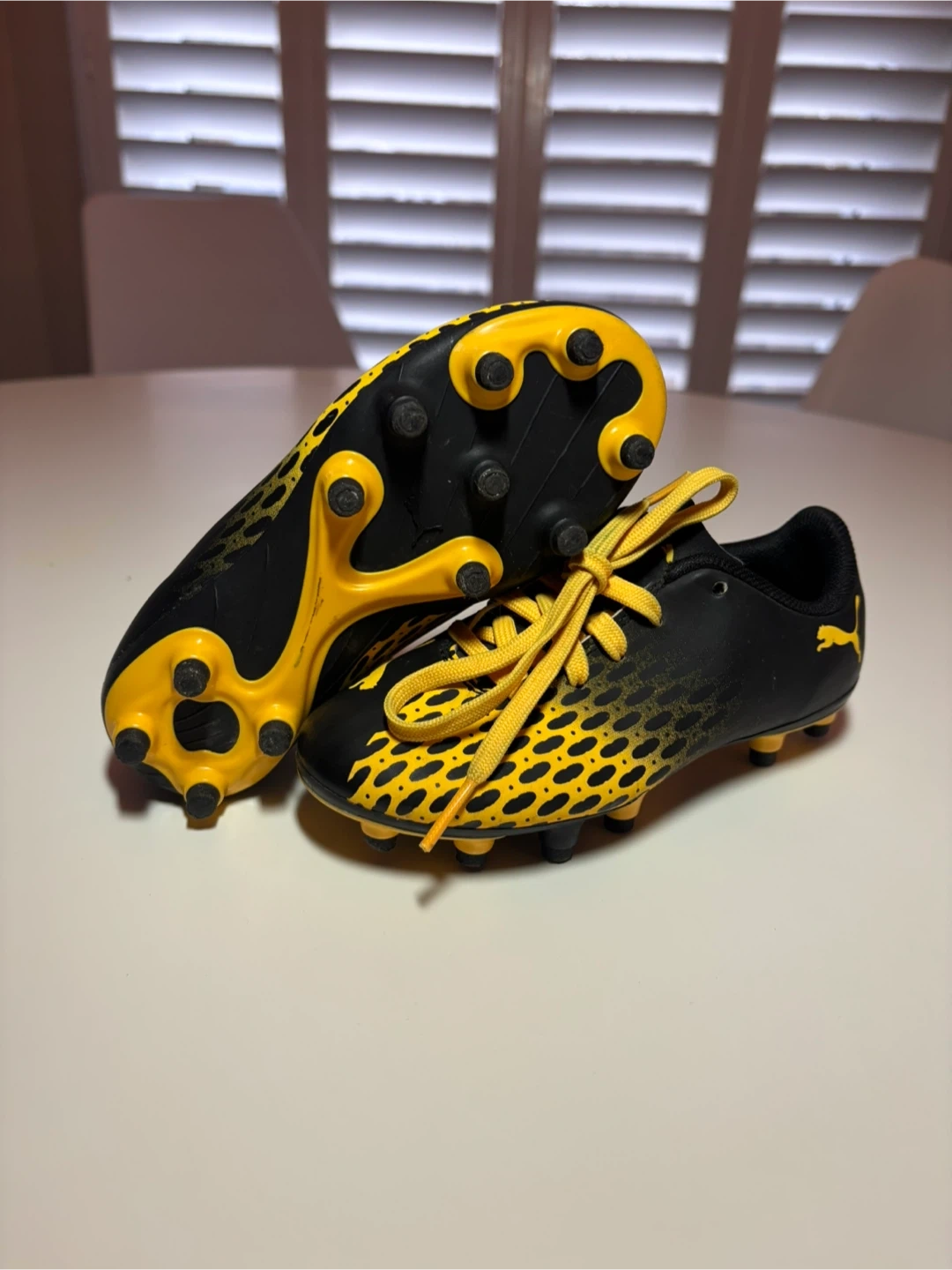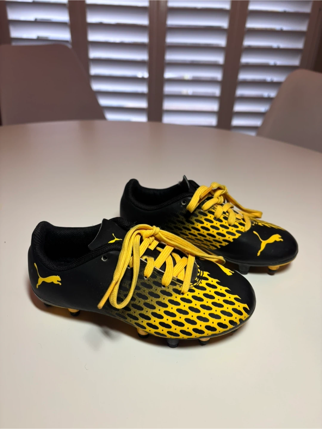 Puma soccer cleats in a black and yellow colourway. Features cleats for traction on the field. Little kids size 10.
