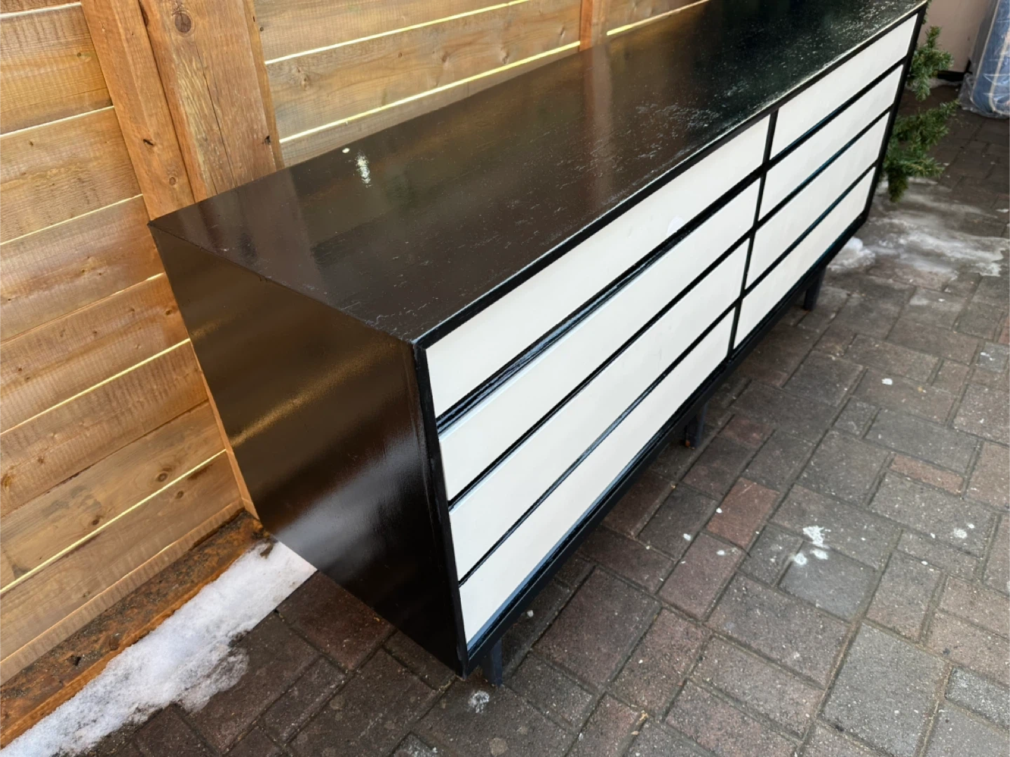 A sleek dresser or credenza a glossy black top and white drawer fronts with black accents. It has six drawers for ample storage. This piece would be a stylish addition to any bedroom or living area.