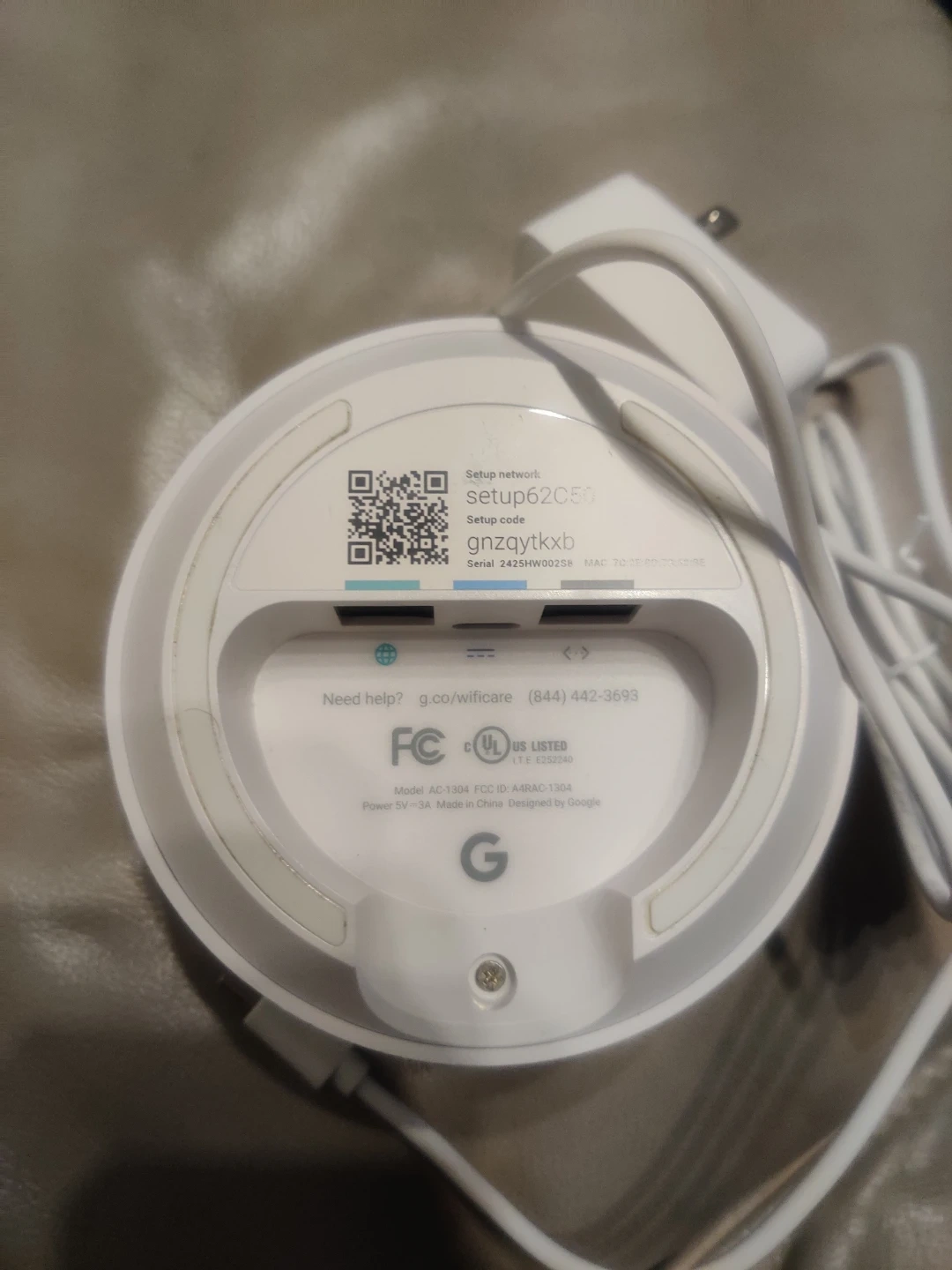 This is a Google Wifi router unit. It's white and comes with its power adapter. Setup code: gnqaytkxb. Model AC-1304.