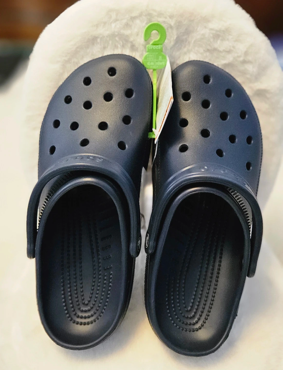 These are navy blue Crocs Classic Clogs. They're a size 10-men's / 12-women's. Made of Croslite material for lightweight cushioning.