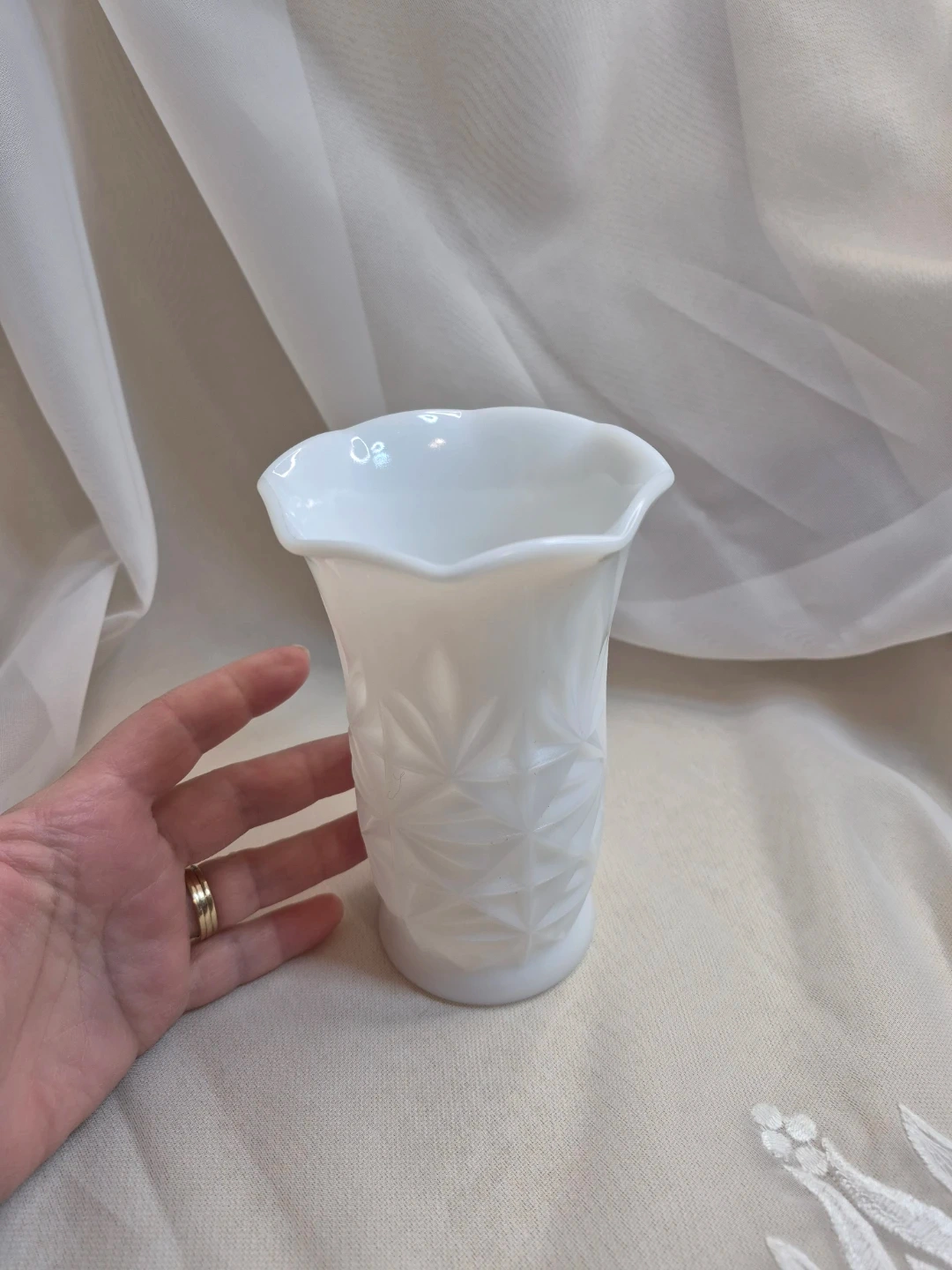 Beautiful Vintage Hazel Atlas White Milk Glass Vase w/ Scalloped Rim & Starburst Pattern 5 3/4 x 3 1/2" Excellent Condition please see all pictures