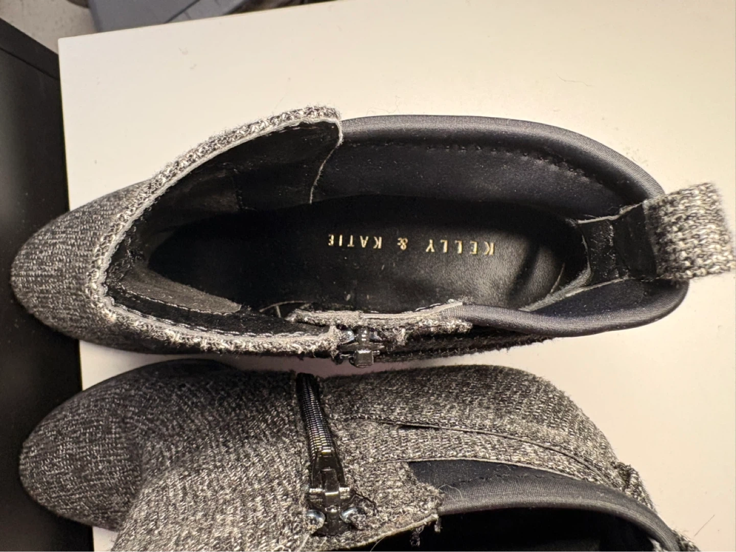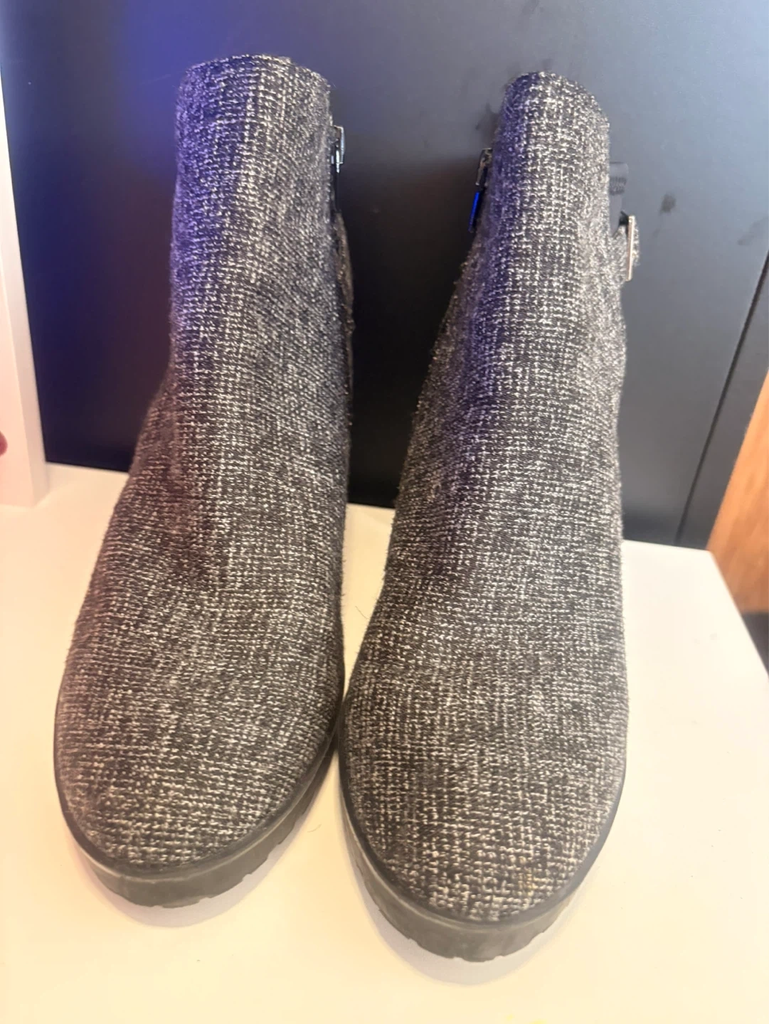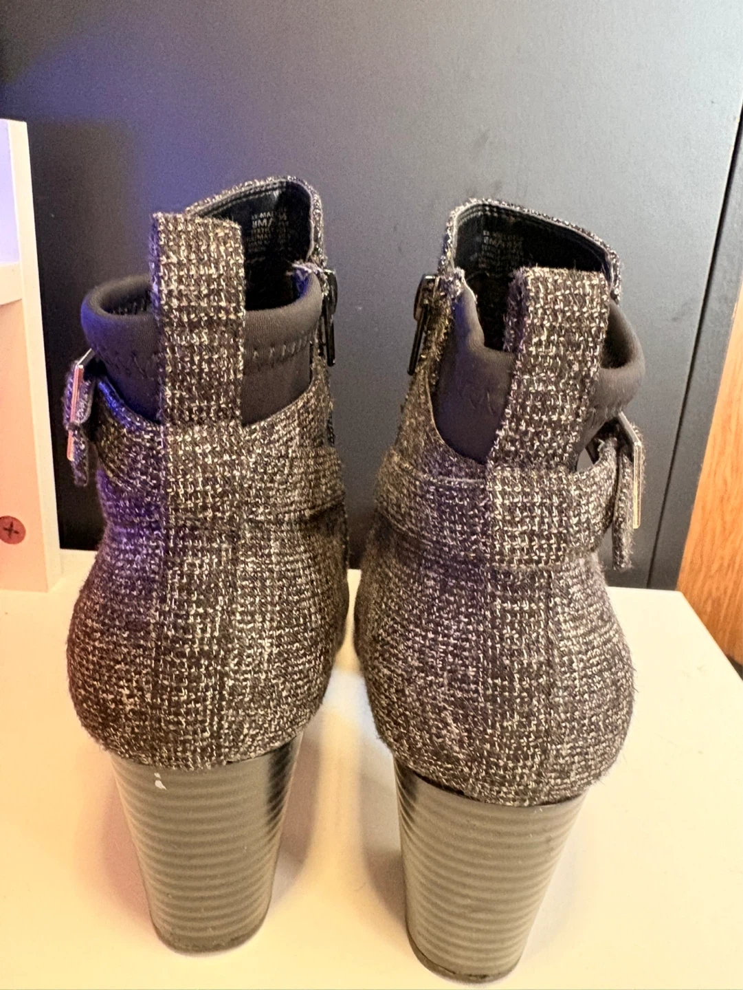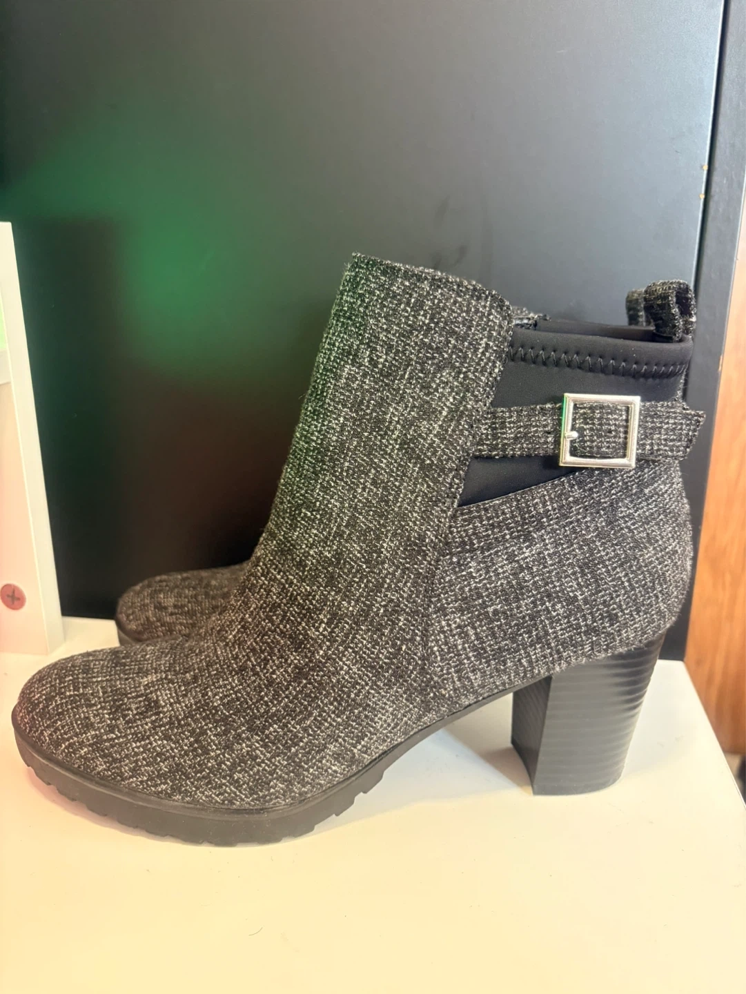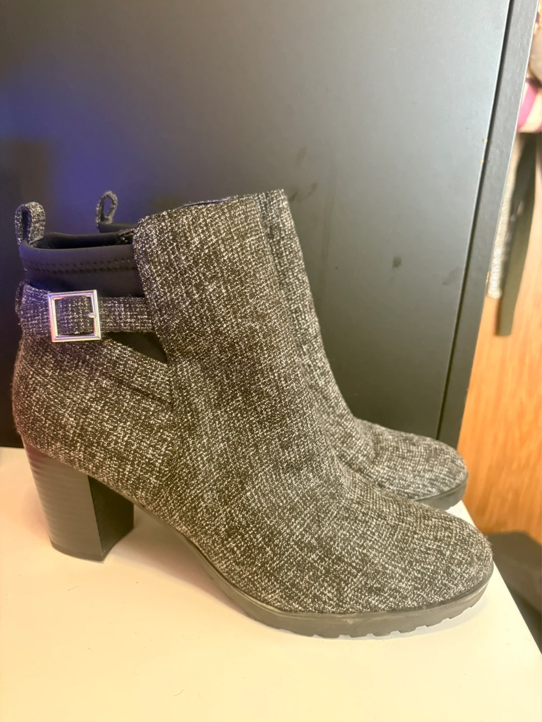 Stylish ankle boots from Kelly & Katie. Features a grey tweed-like fabric and an adjustable buckle strap. Side zipper closure for easy on and off. Chunky block heel for comfortable height.