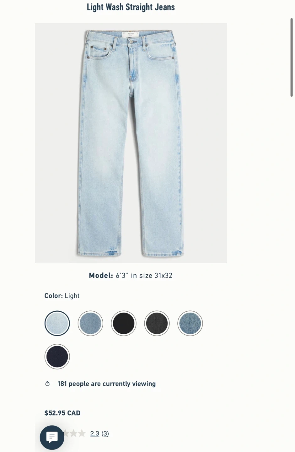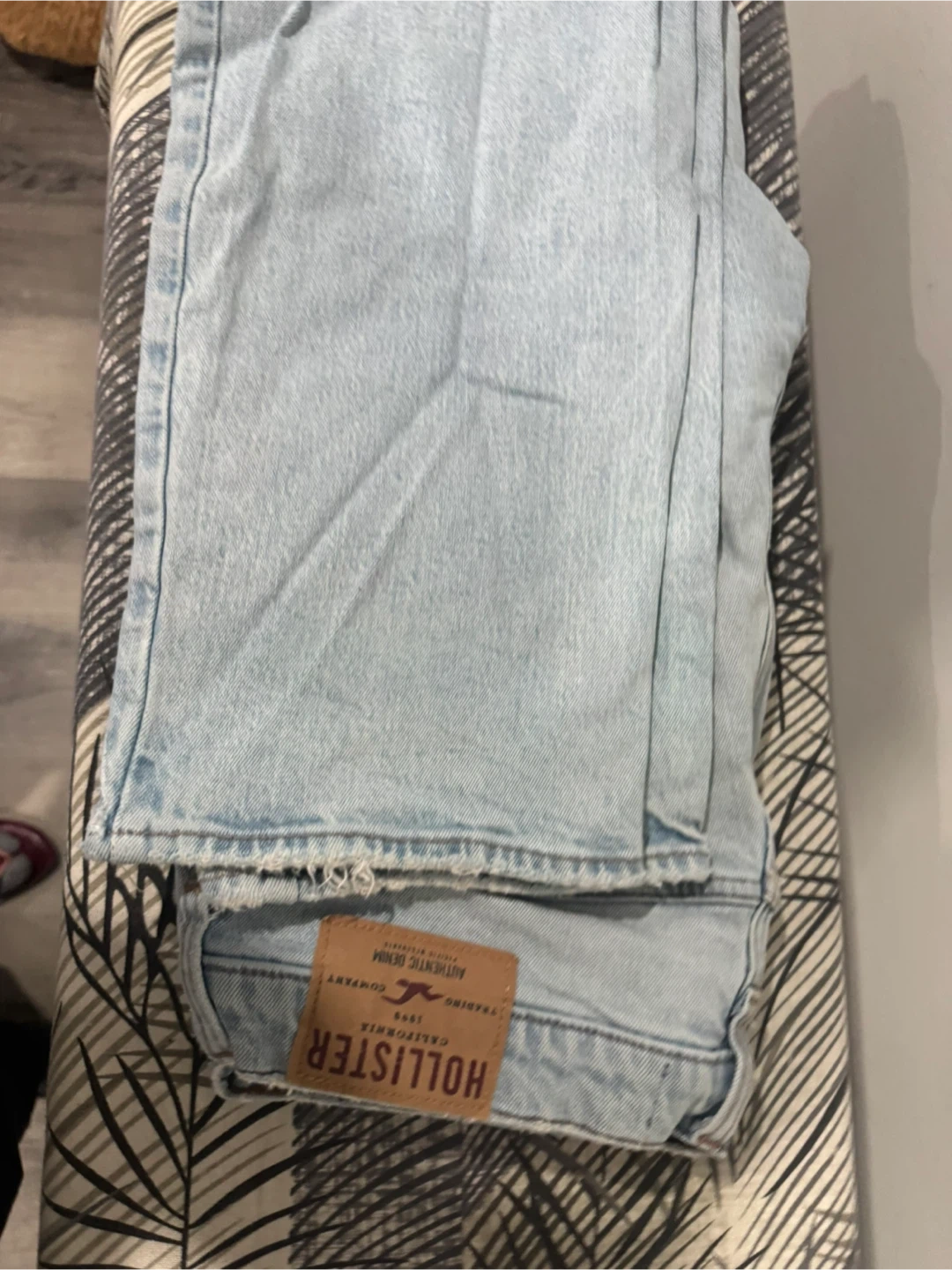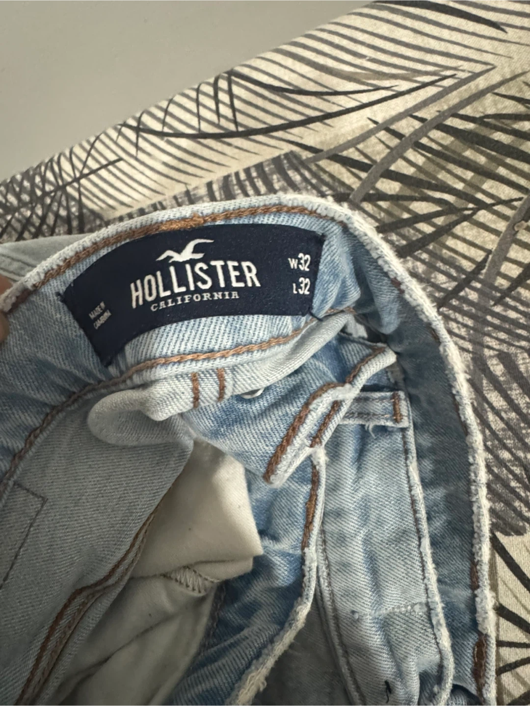 These are light wash straight jeans from Hollister. They're a size W32 L32. Denim material.