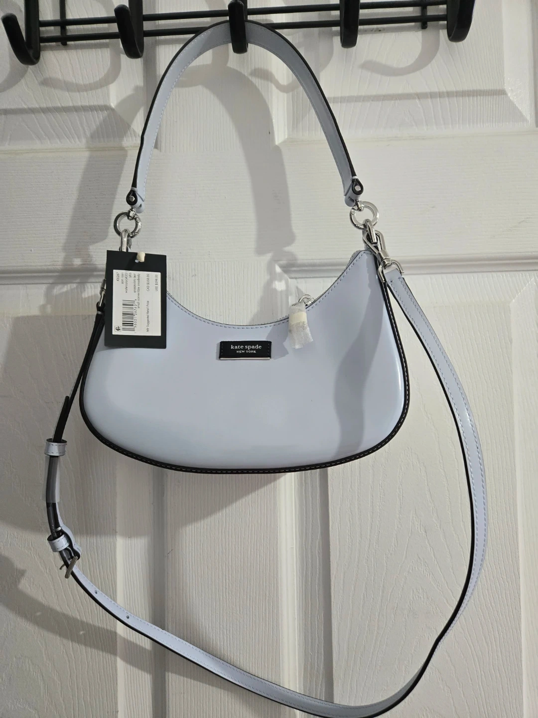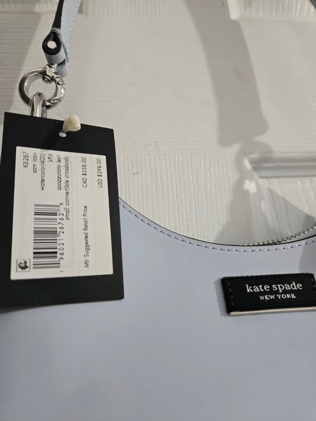 This is a Kate Spade small convertible crossbody bag. It's made of spazzolato leather in a light blue watercolour hue. The strap is adjustable for comfort and versatility.
