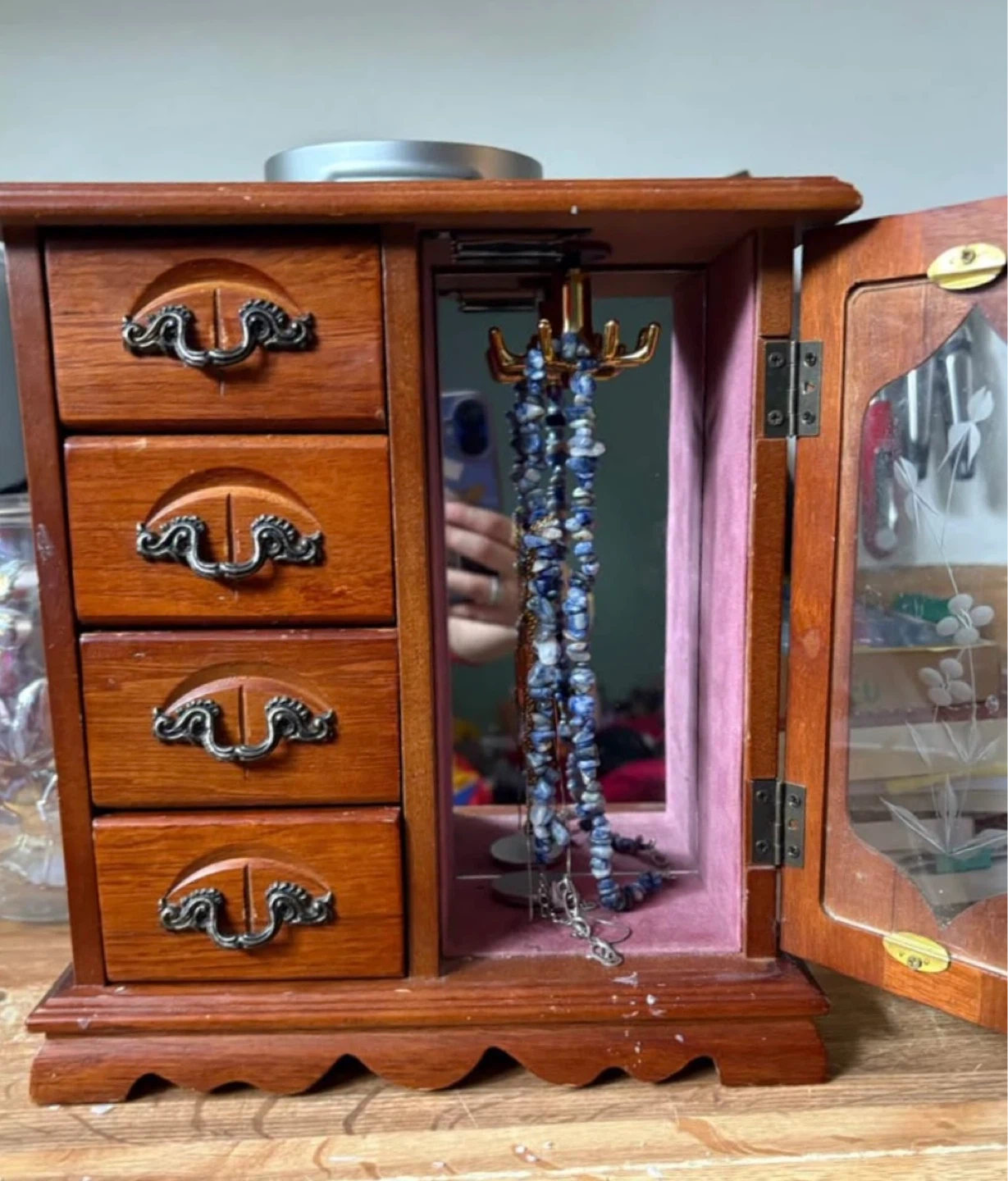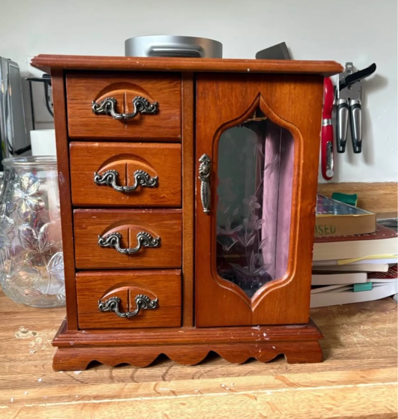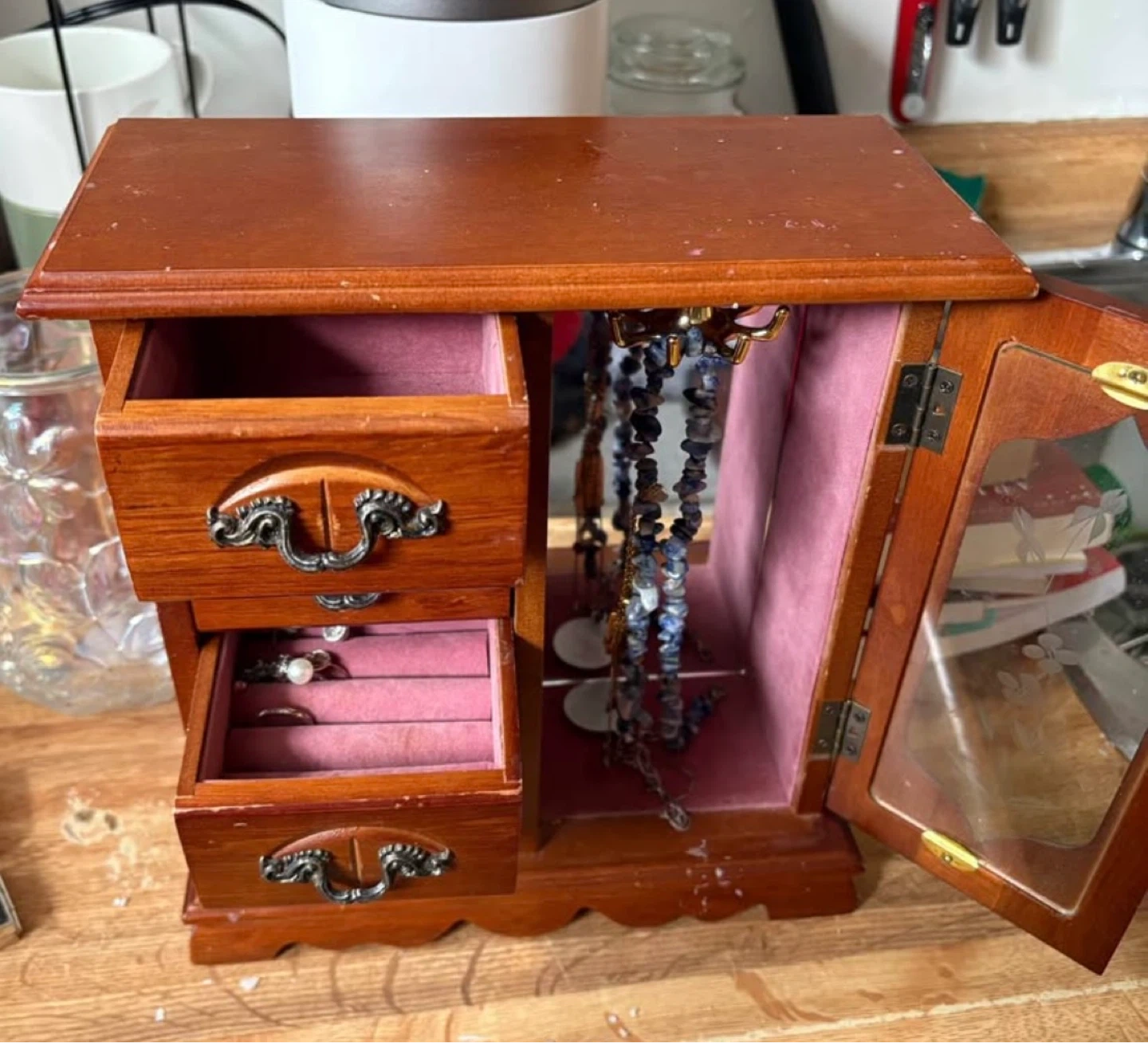 This is a lovely wooden jewelry box with four drawers and a glass door. It's lined with pink velvet and has a mirror inside. Perfect for organizing your earrings, necklaces, and rings! It’s very very lightly used with no damage and in perfect condition. Only getting rid of because I don’t have the space! The white markings in the photos are just candle wax and will removed before pickup!