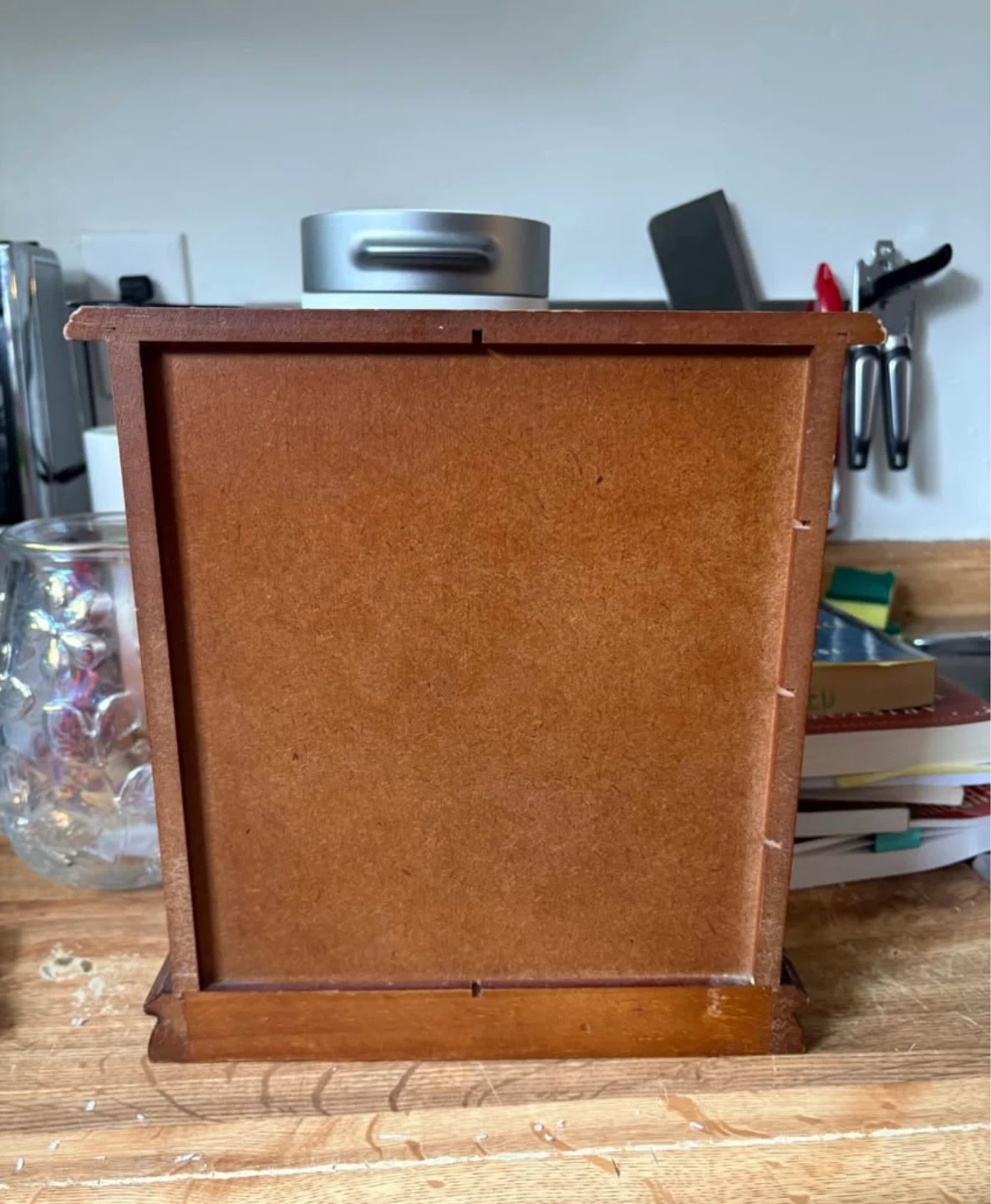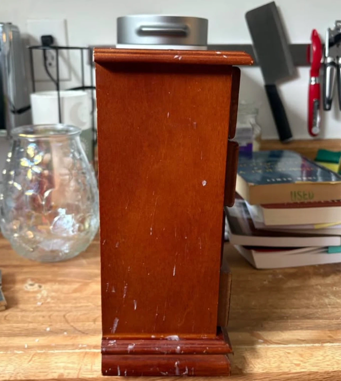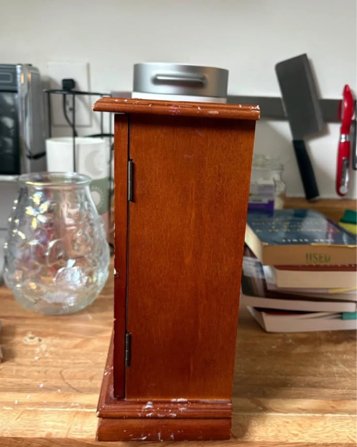 This is a lovely wooden jewelry box with four drawers and a glass door. It's lined with pink velvet and has a mirror inside. Perfect for organizing your earrings, necklaces, and rings! It’s very very lightly used with no damage and in perfect condition. Only getting rid of because I don’t have the space! The white markings in the photos are just candle wax and will removed before pickup!