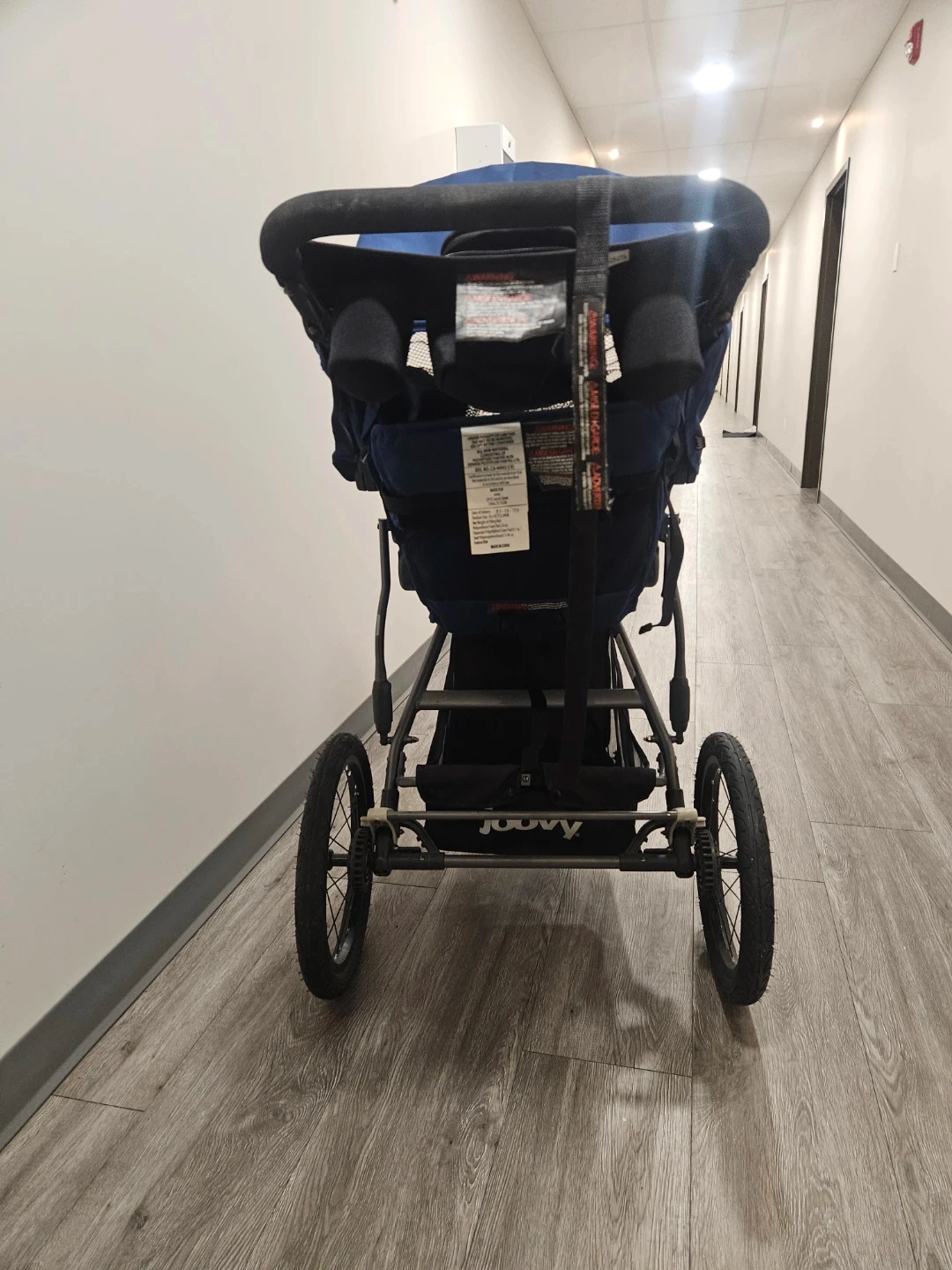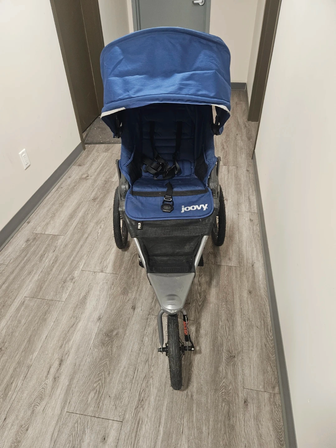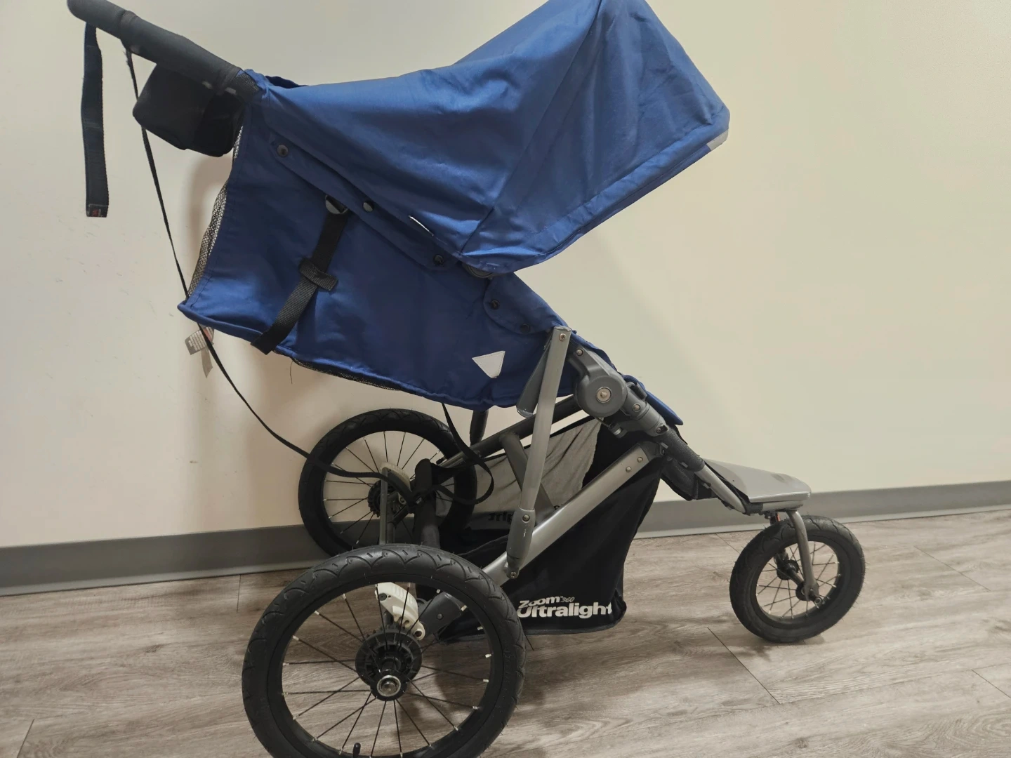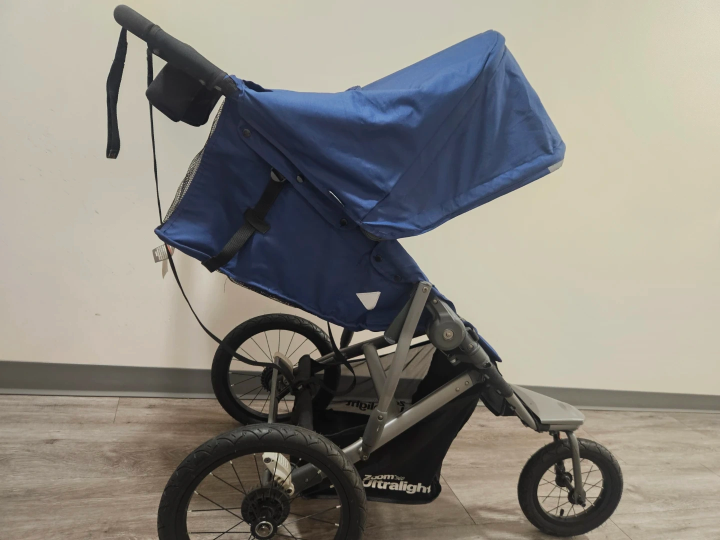 This Joovy Zoom Ultralight stroller is blue. It's a jogging stroller with three large wheels for a smooth ride. The canopy offers sun protection.