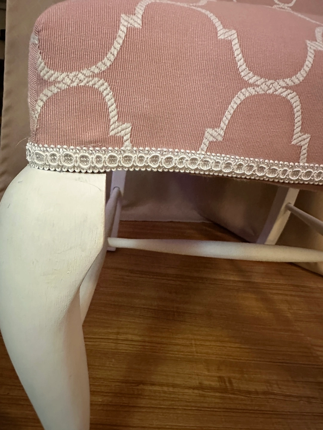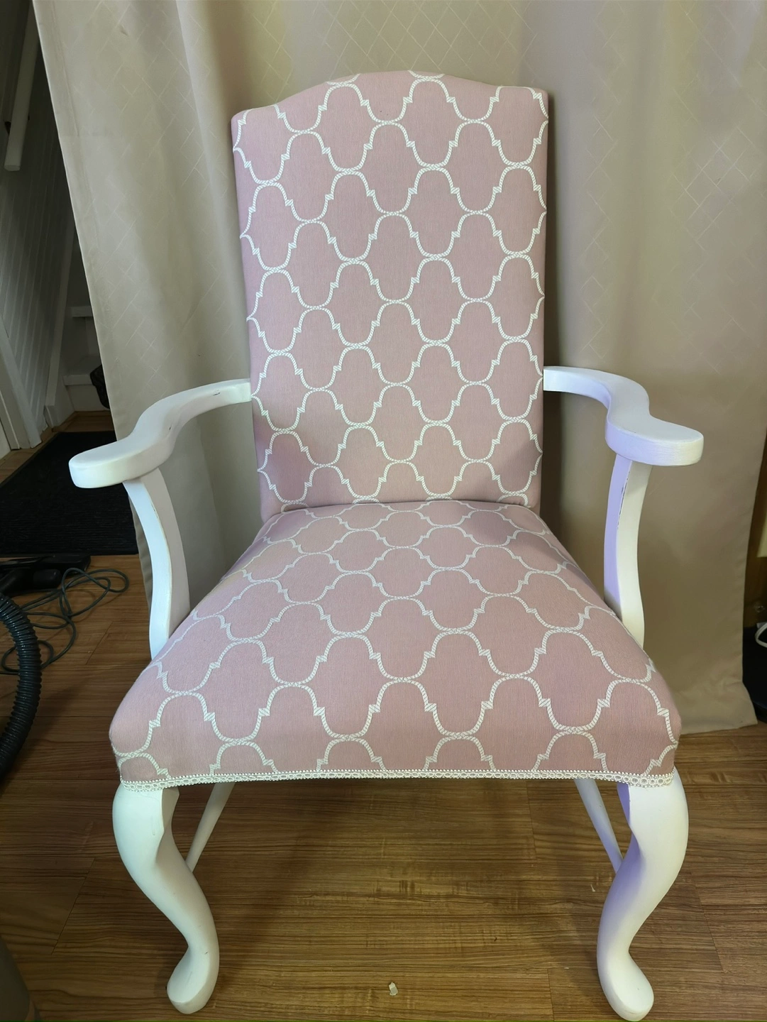 Beautiful pink armchair. White painted legs. Cabriole legs. Newly reupholstered. Geometric pattern fabric. Elegant details and great addition to any room.