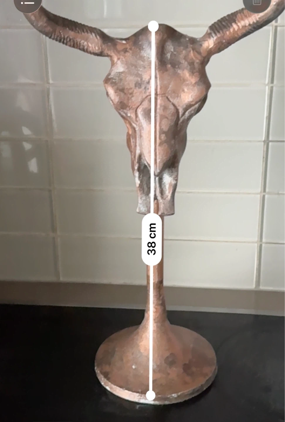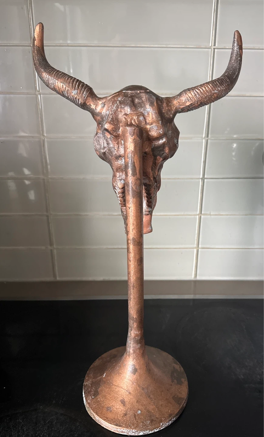 A decorative bull skull statue with a copper finish. It stands approximately 38 cm tall. This piece adds a unique, rustic touch to any space. Great for a mantelpiece or shelf! I loveee the rustic, copper colors it has.