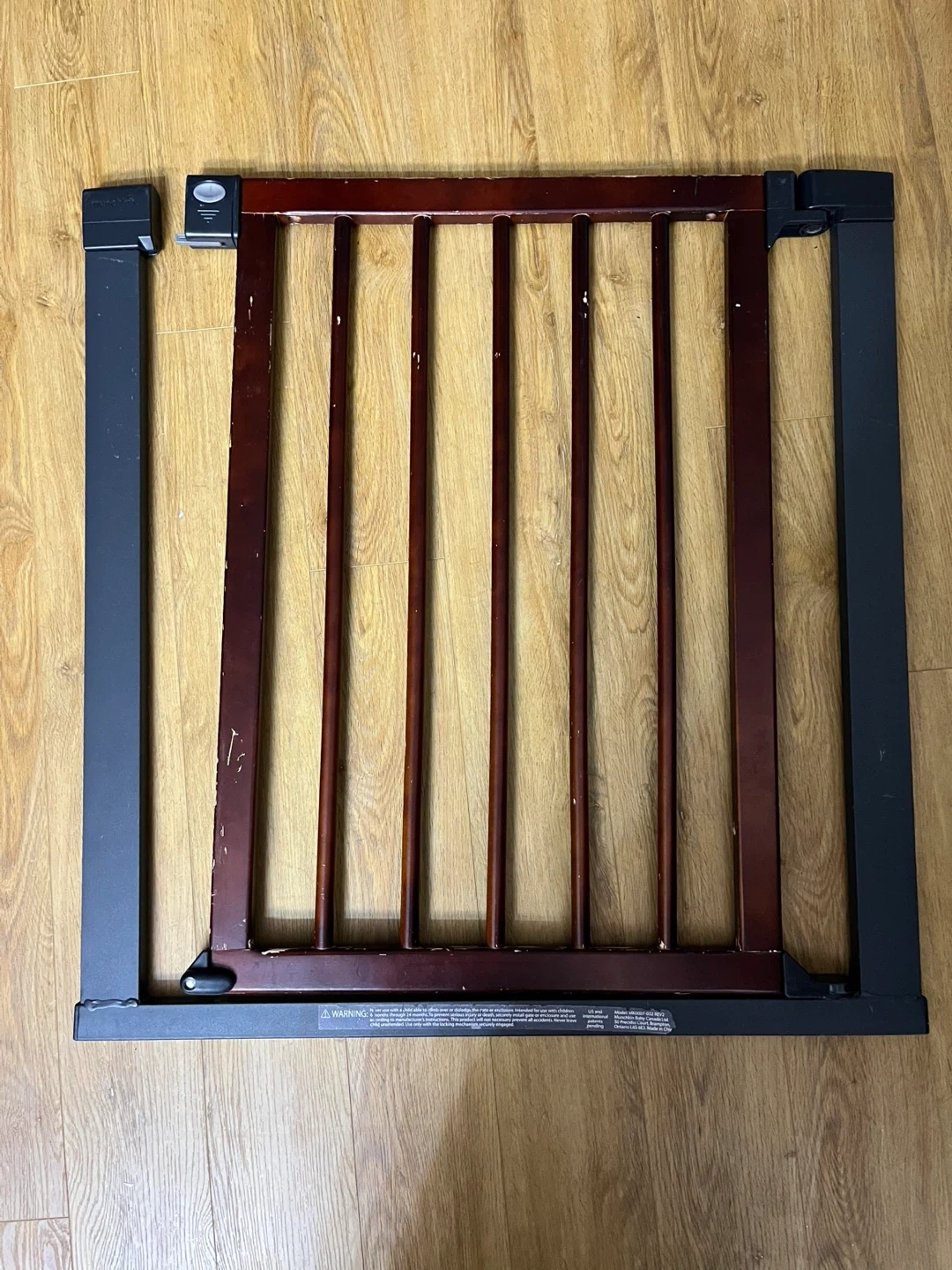 This is a Munchkin wooden baby gate with dark brown wooden slats and black metal framing. It's designed to keep little ones safe. Some wear and tear on the wood finish.
