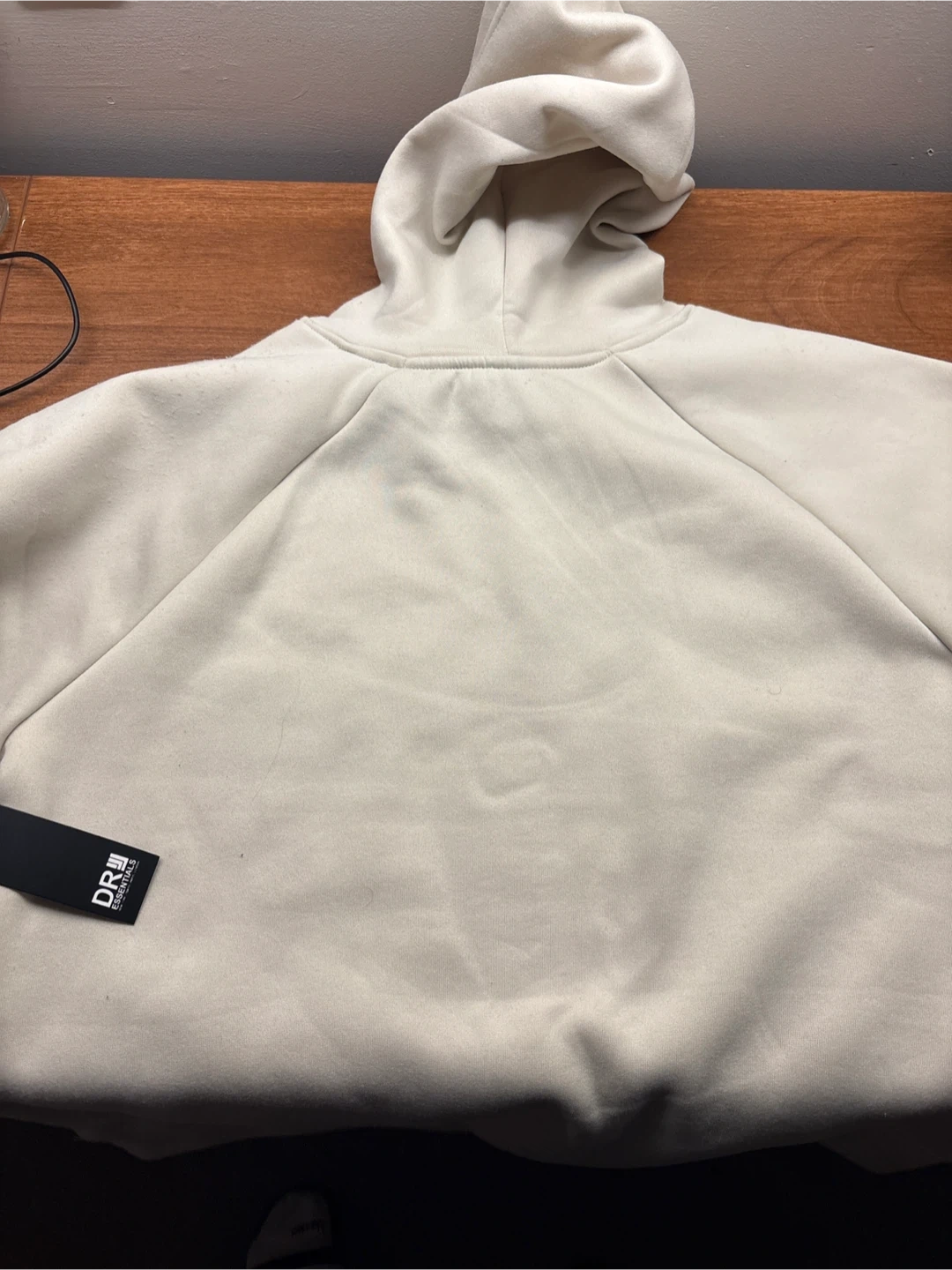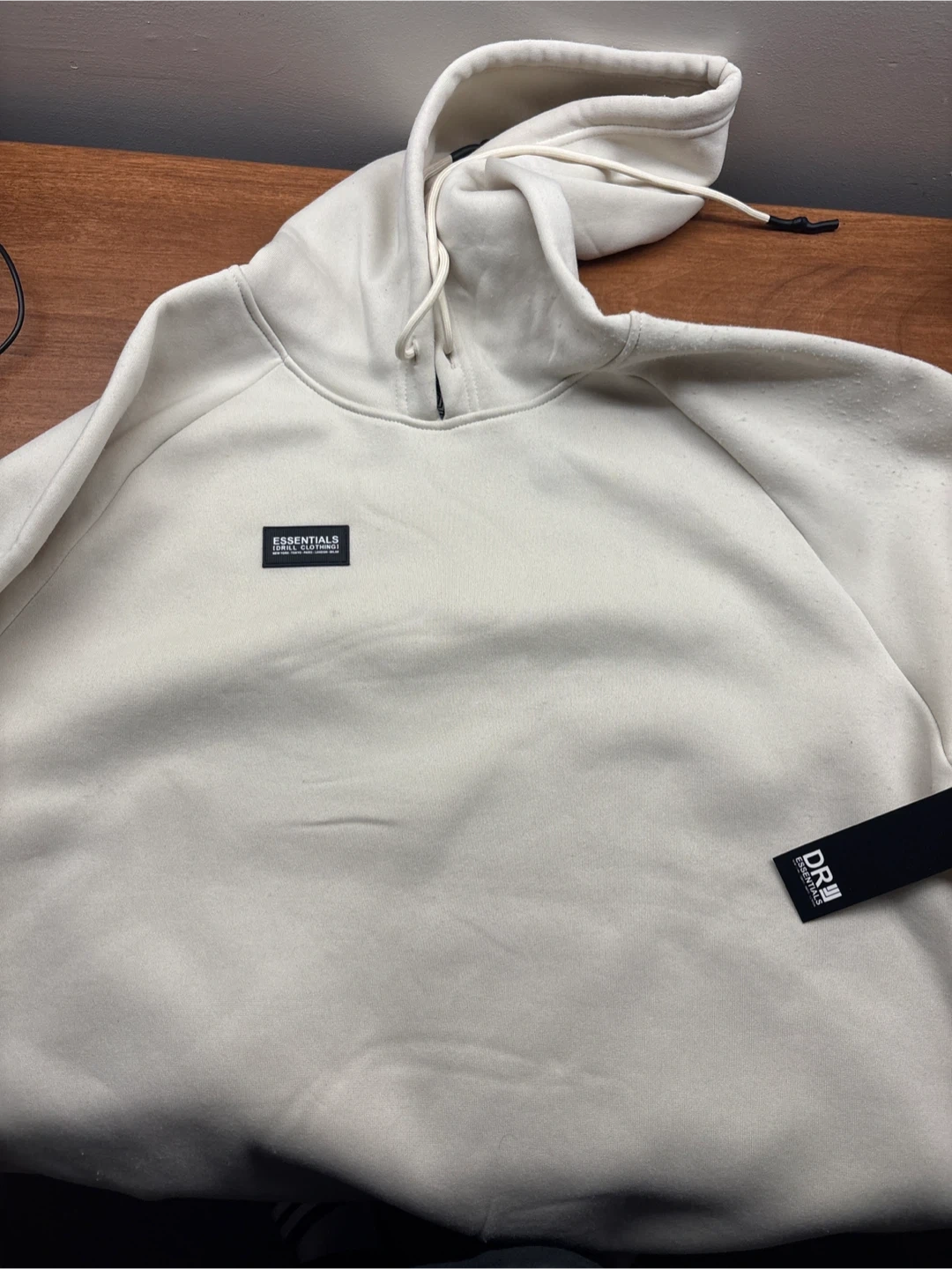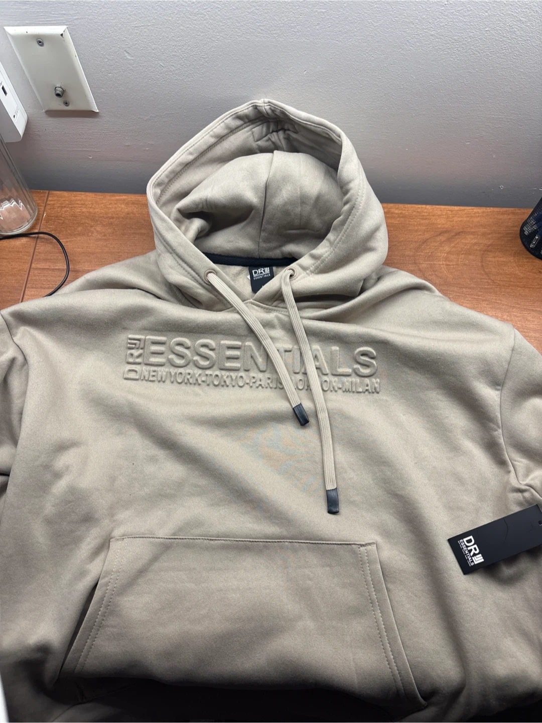 ESSENTIALS hoodie with "NEW YORK-TOKYO-PARIS LON-MILAN" embossed on the front. Cotton blend material. Includes original tags.