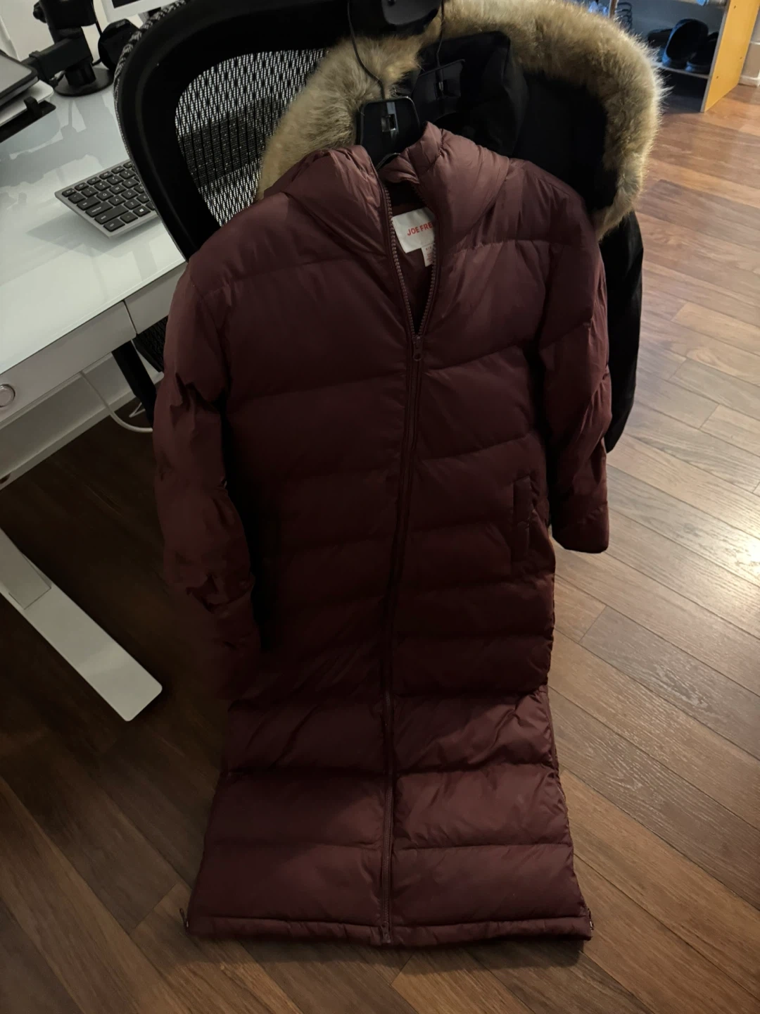 Selling a Joe Fresh puffer coat in a lovely burgundy colour! It's a long, warm coat, perfect for those chilly Canadian days. Great for staying cozy and stylish!