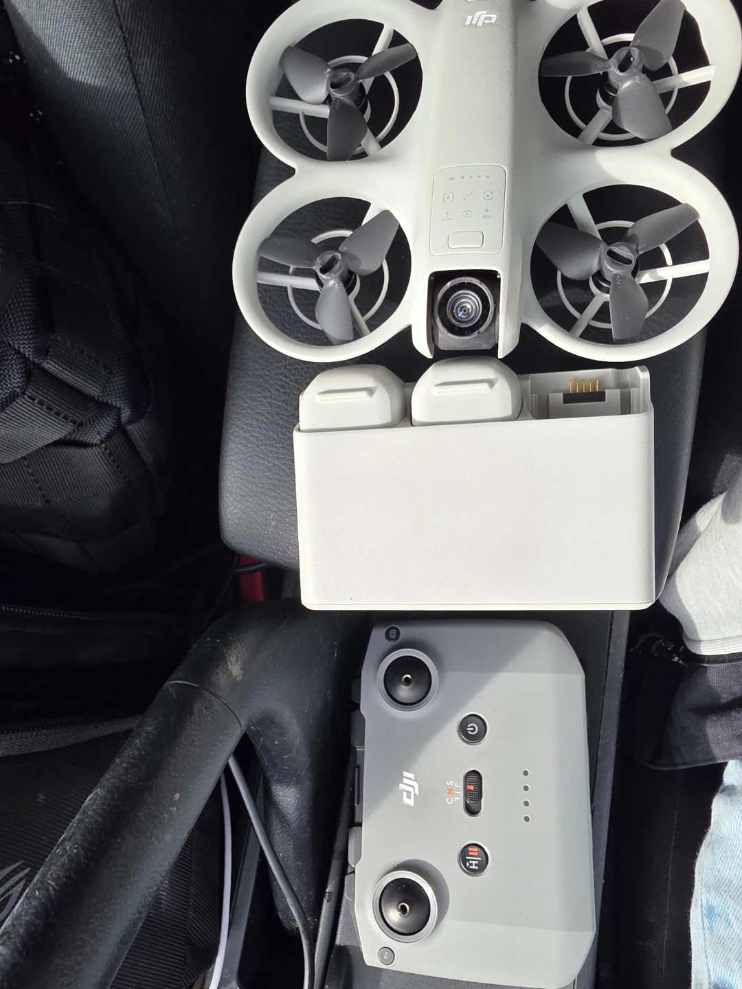 This is a white DJI Neo drone, comes with a controller and a battery charging hub. It's a neat piece of tech for aerial photography and videography! The controller is grey and features dual joysticks and mode selection.