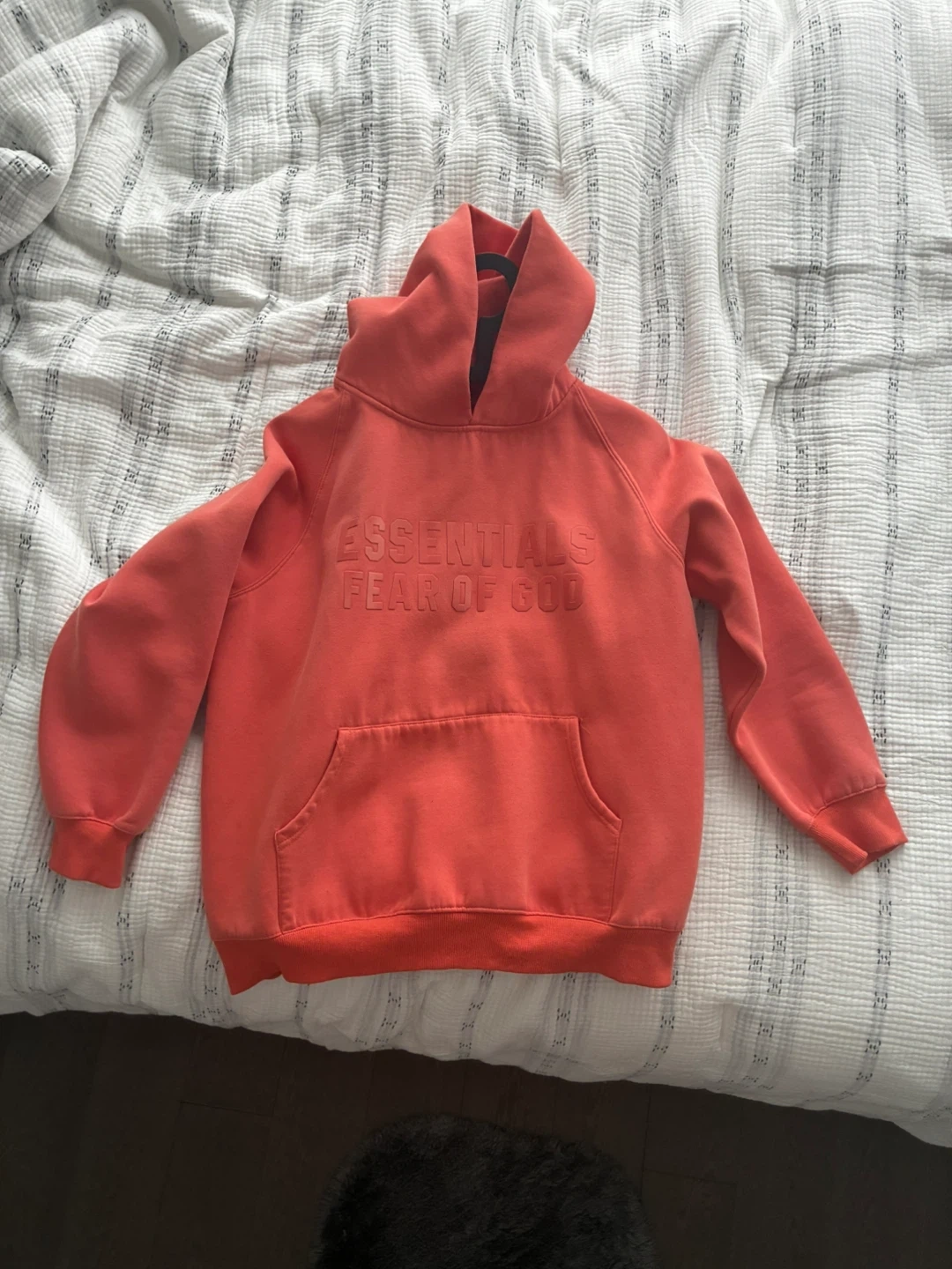 This is a Fear of God Essentials hoodie in a coral colour. It features a front kangaroo pocket and an embossed logo on the chest. Made from a comfortable cotton blend.