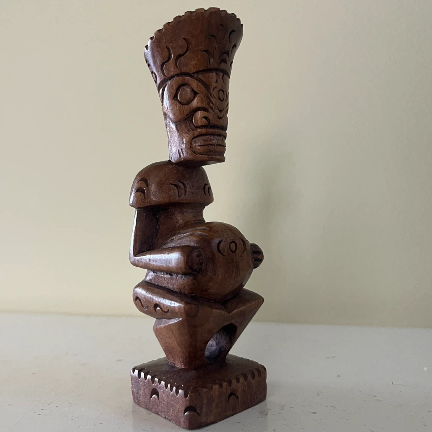 Hand-carved Polynesian hardwood tiki statue. Measures approximately 8 inches tall.