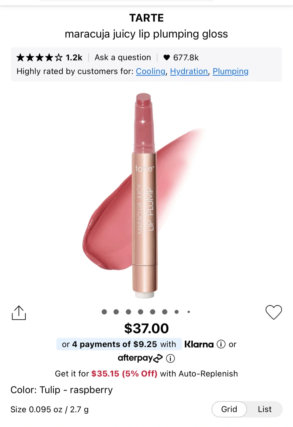 Tarte Maracuja Juicy Lip Plump in the shade Tulip. Net weight 2.7 g / 0.095 Oz. Made in Korea.