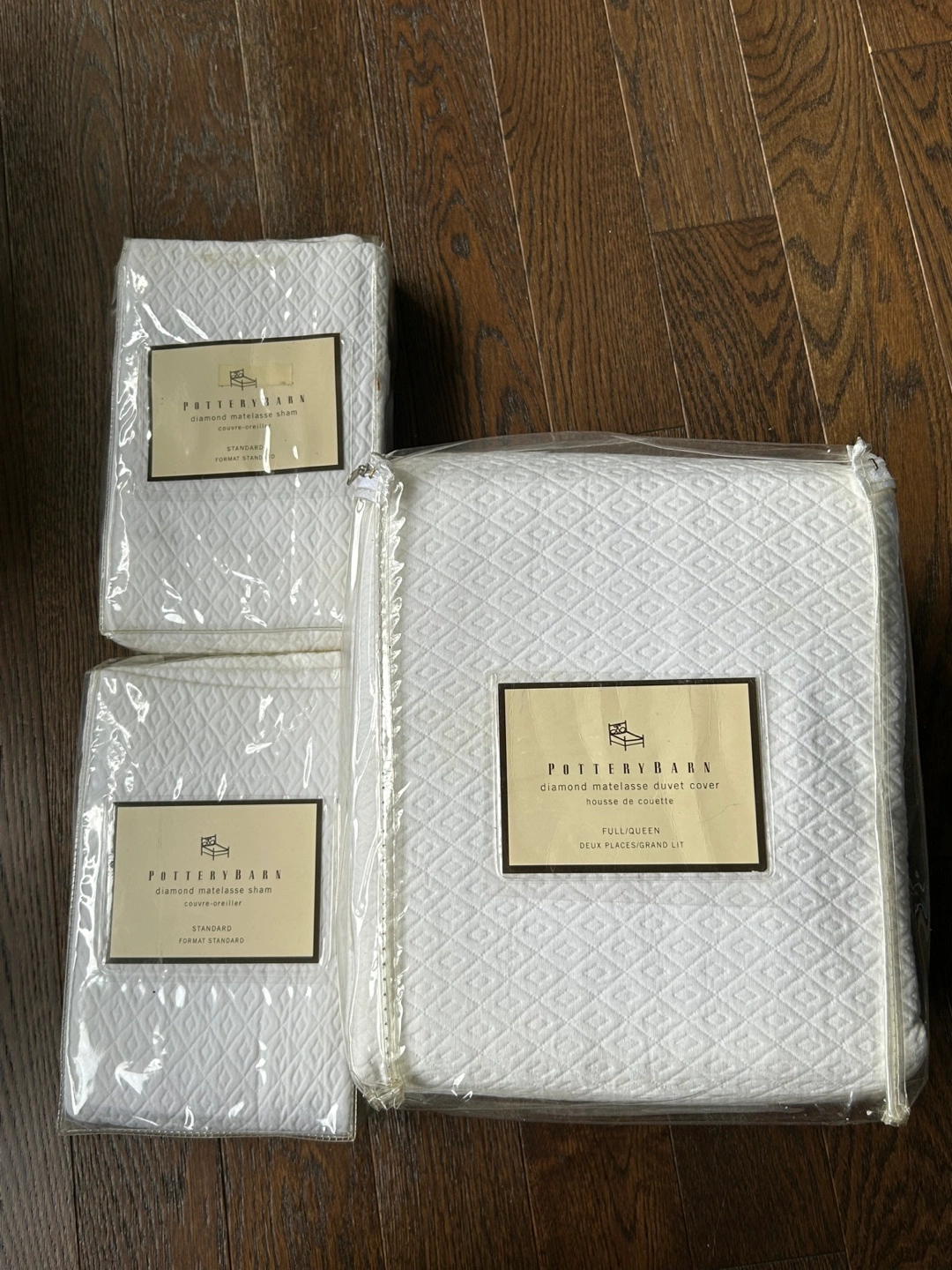 Selling a Pottery Barn Diamond Matelasse duvet cover (Full/Queen size) and two standard shams. They're all brand new and still in their original packaging!