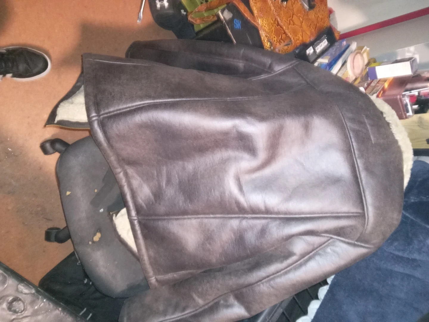 This men's brown faux leather bomber jacket features a cozy shearling lining and collar. It has a full zip closure and two front pockets. Excellent for keeping warm on cooler days!