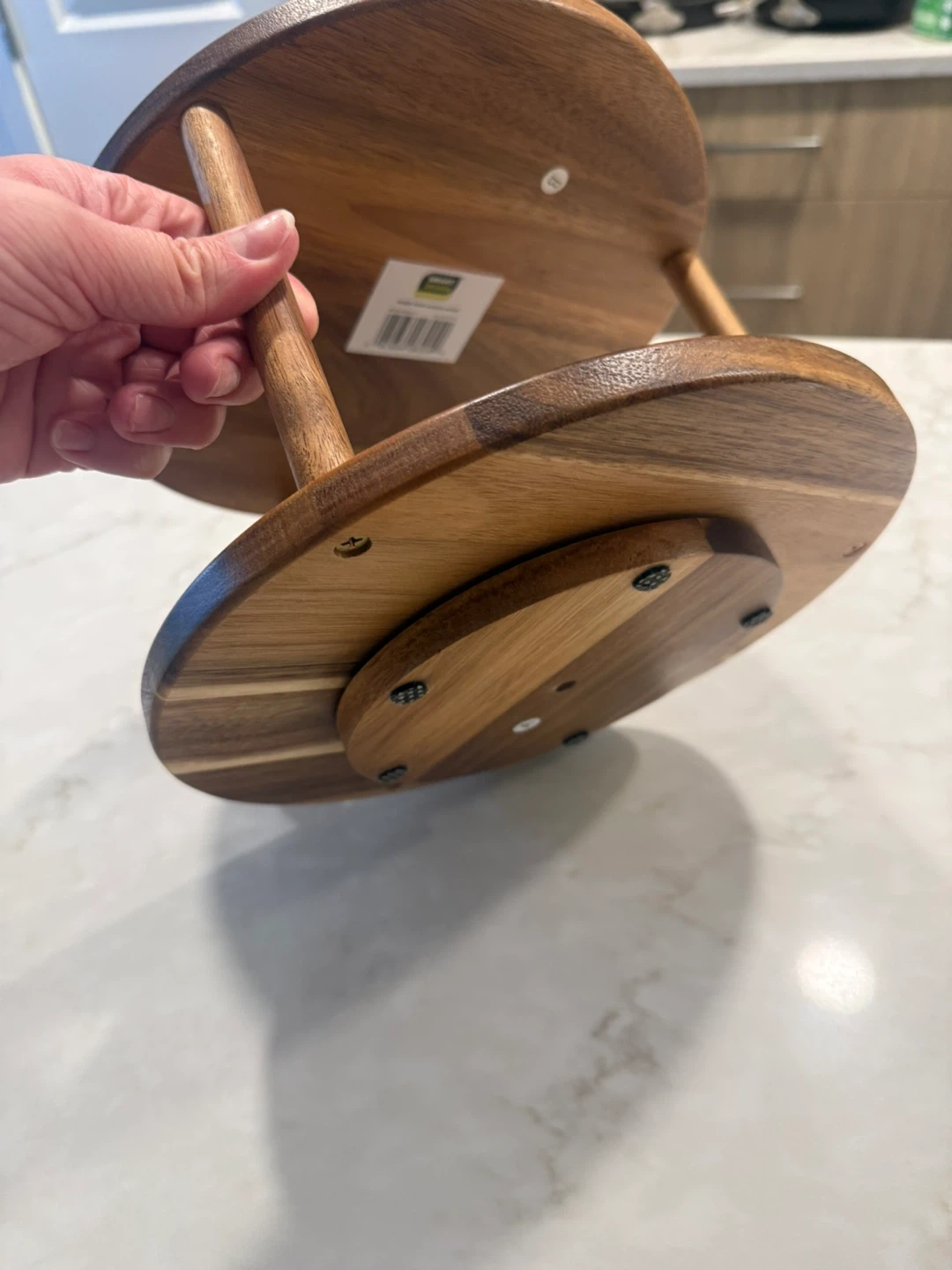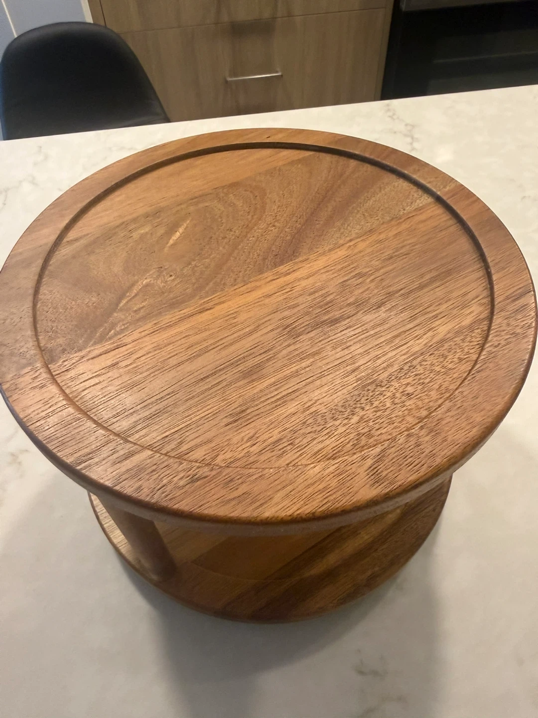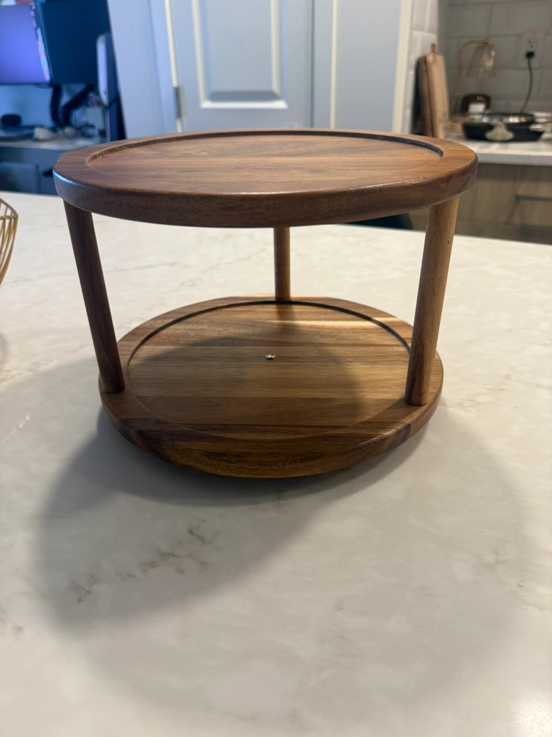 Two-tiered wooden serving stand made from warm-toned wood. It's perfect for displaying desserts or appetizers at parties. The stand has a nice, natural wood finish.