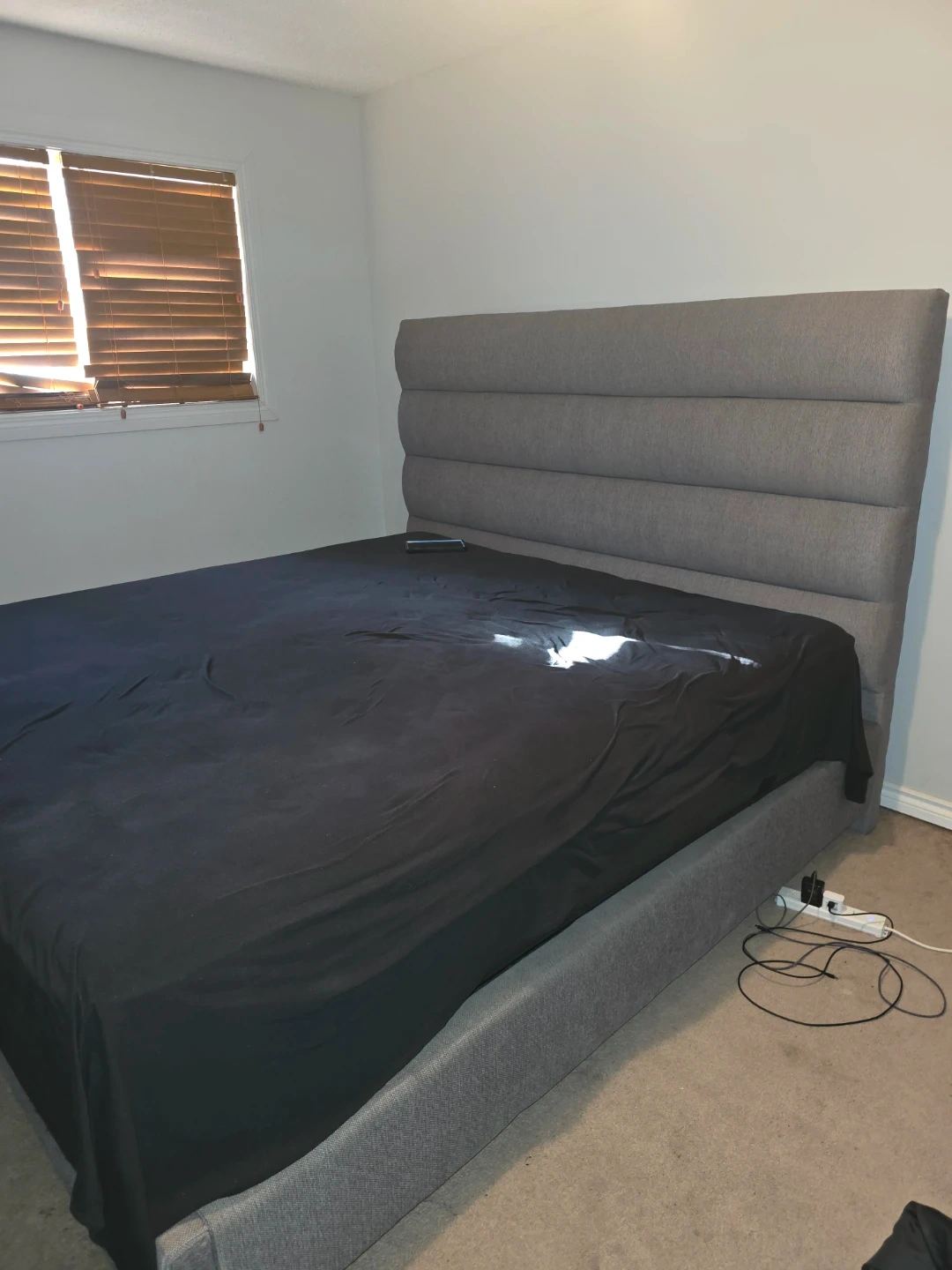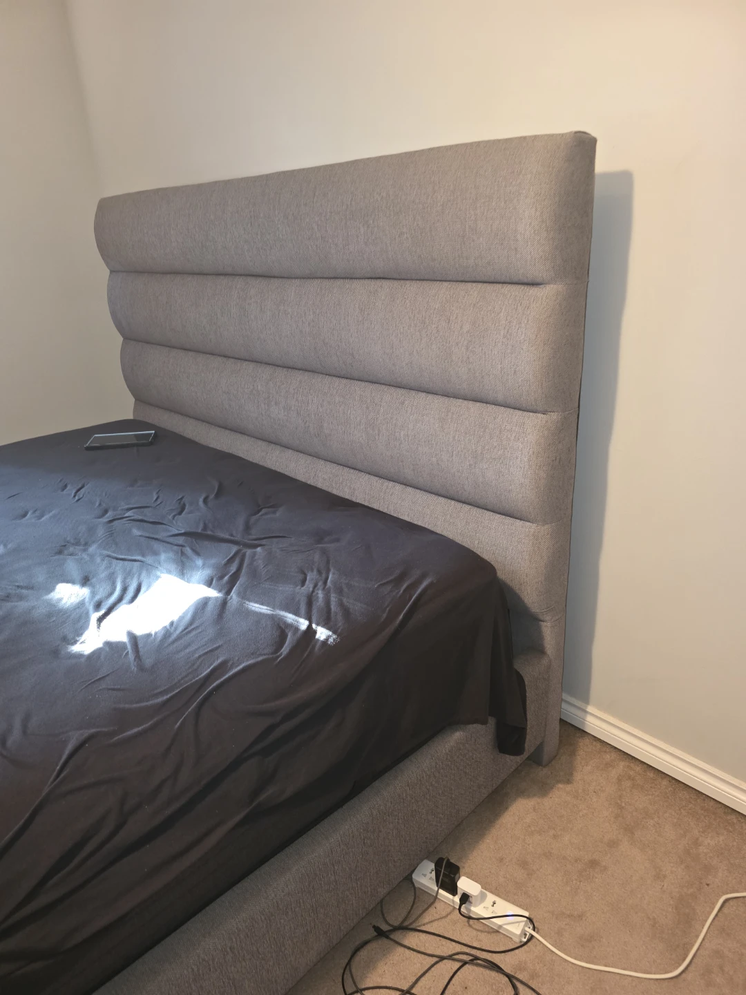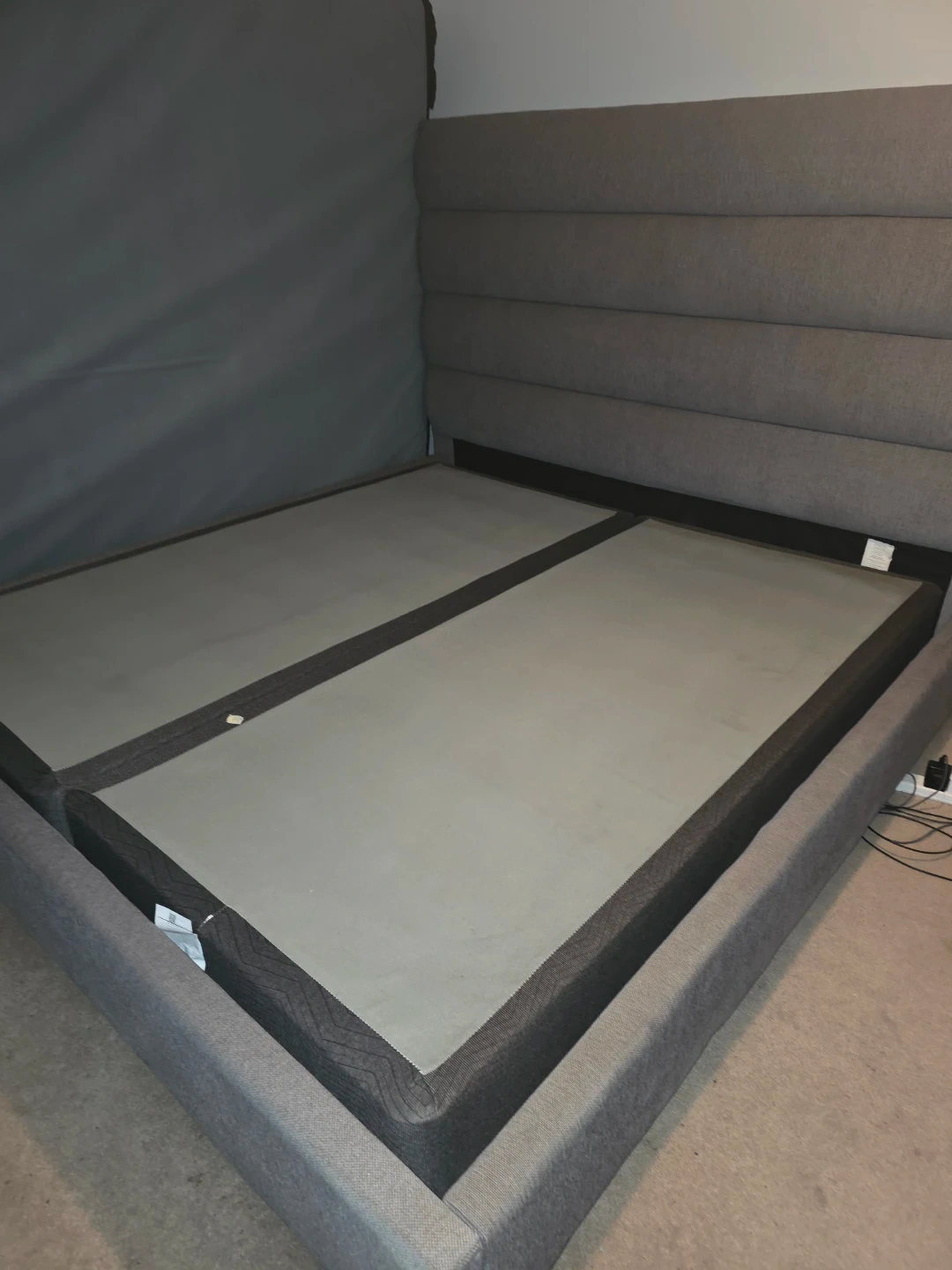King size bed frame and bed with a modern grey upholstered finish. Features a stylish horizontally tufted headboard. Platform base supports mattress without a box spring.