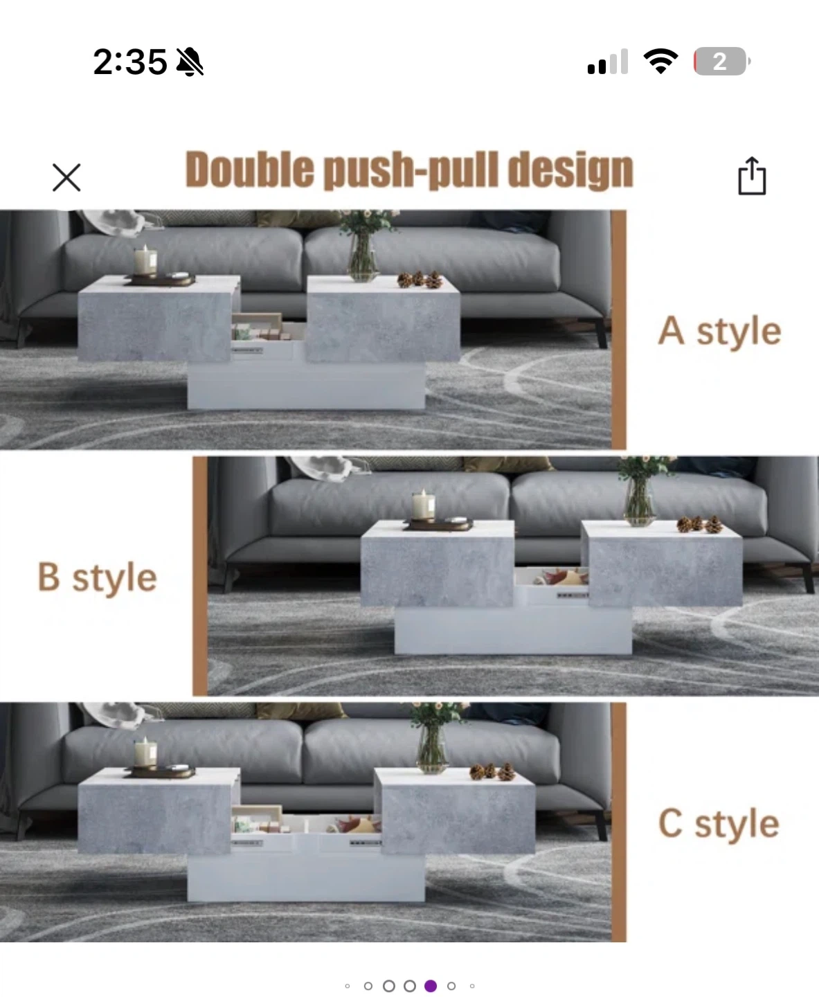 Stylish coffee table featuring a modern grey concrete-look finish with a white base. It boasts a clever double push-pull design for easy access and hidden storage. Dimensions: 59.8" W x 20.1" D x 15.8" H.