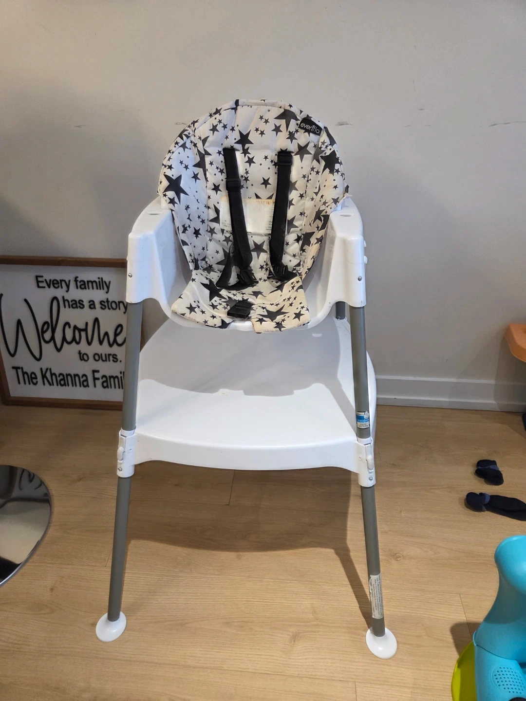 This Evenflo high chair features a fun star-print seat pad and a white plastic tray. It's designed for little ones during meal times. The seat pad is removable for easy cleaning. A great addition to any kitchen or dining area for feeding your baby! It converts to table and chair