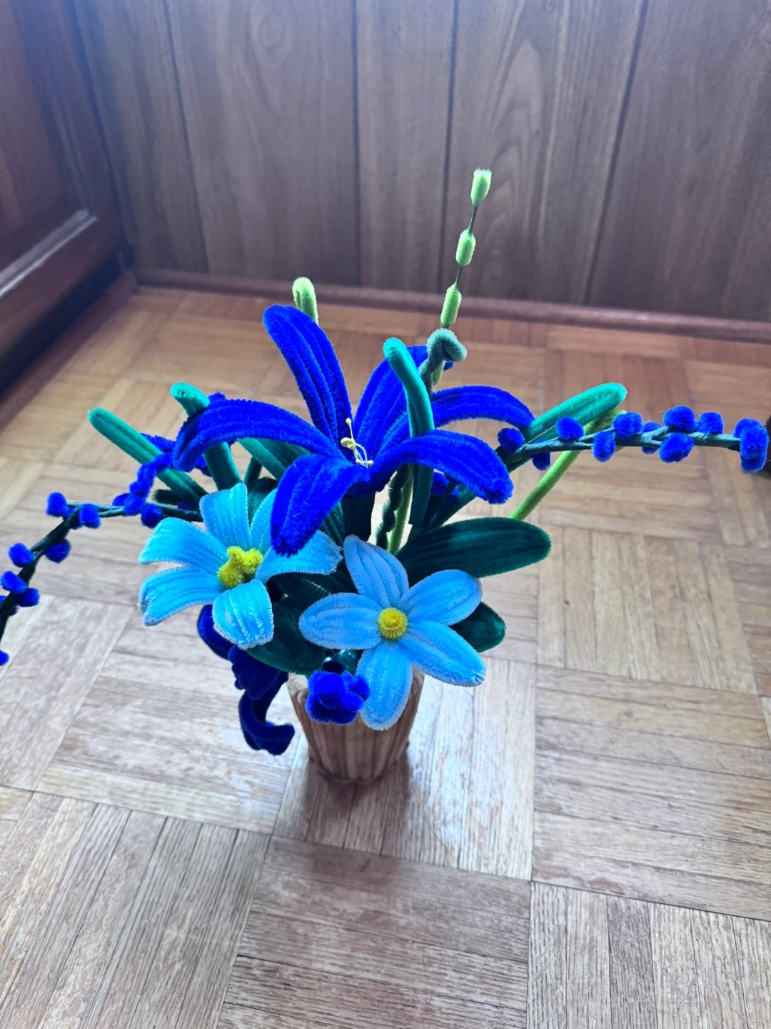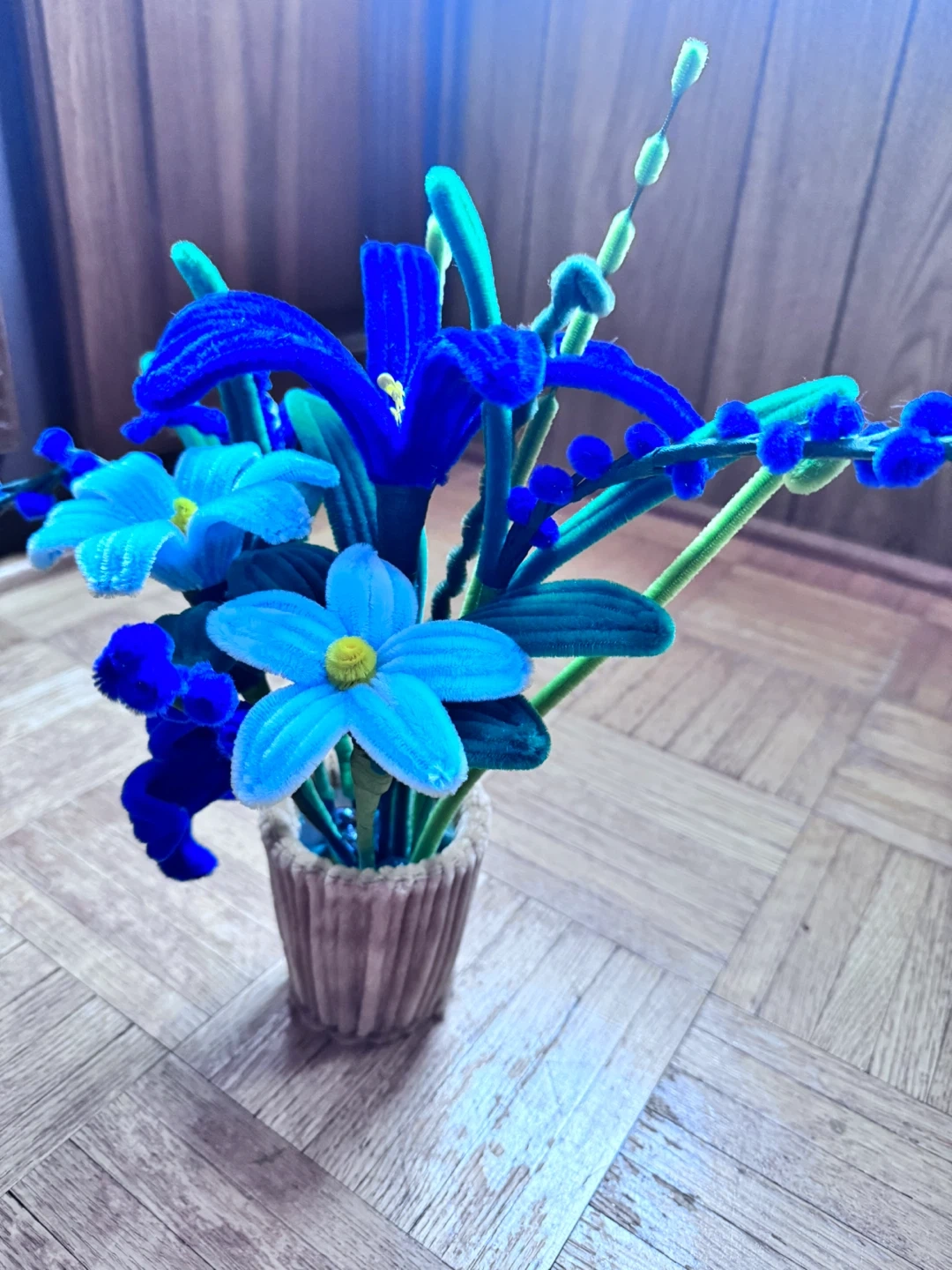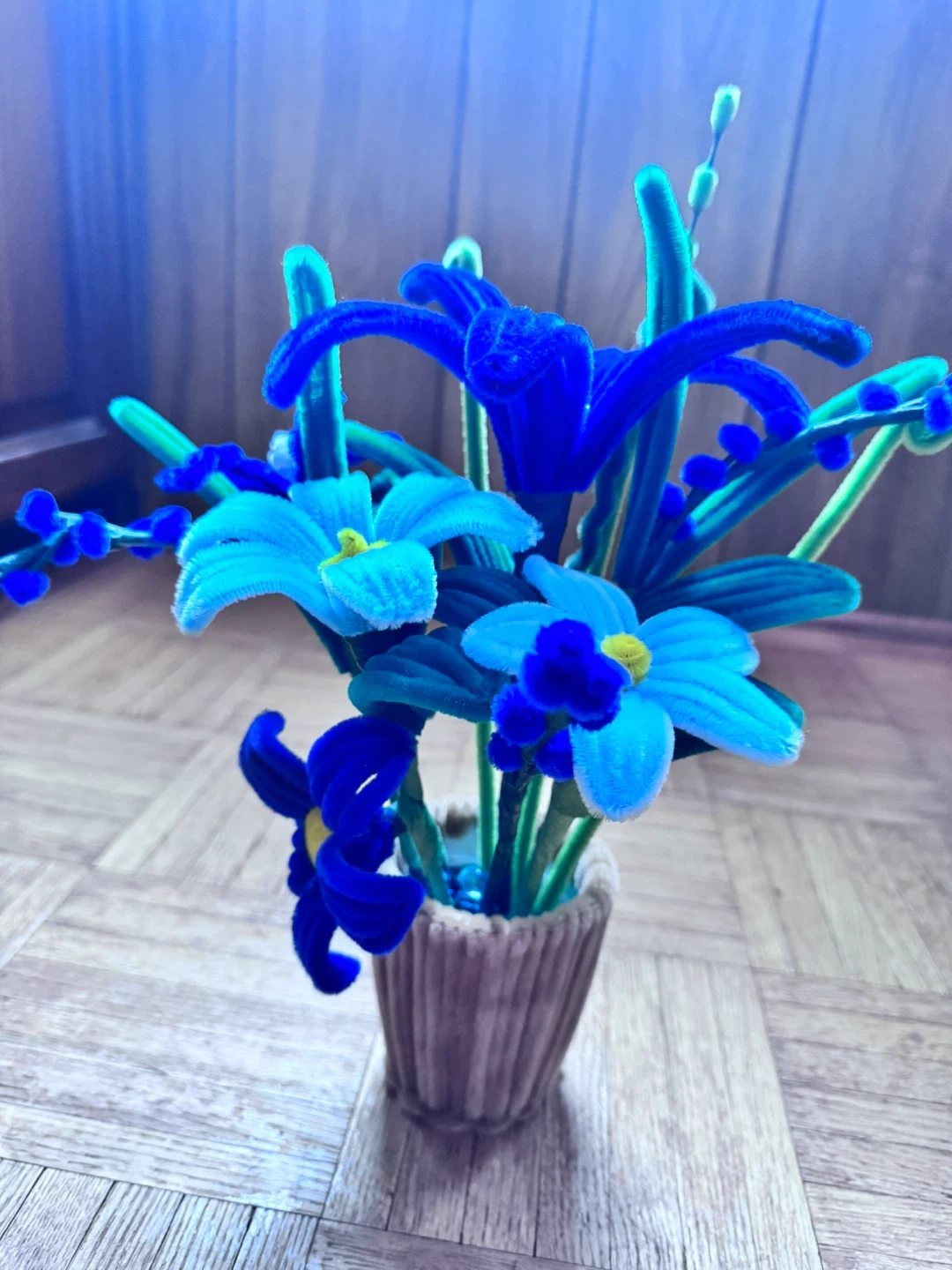 A handmade flowers crafted from blue and green pipe cleaners. Each flower features bright blue petals and yellow centres, with green stems and leaves. These decorative blooms add a pop of colour to any space.