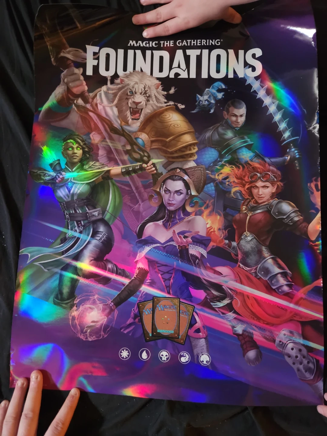 This poster features artwork from Magic the Gathering's Foundations set. It showcases several iconic characters in a vibrant, holographic design. The poster includes the Magic the Gathering logo and the Foundations title.