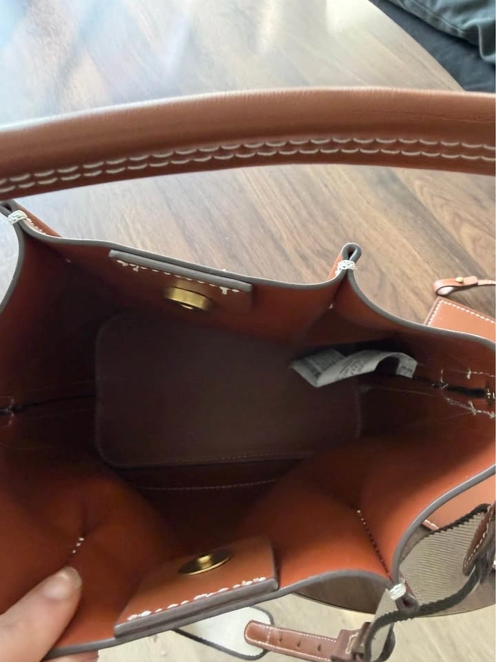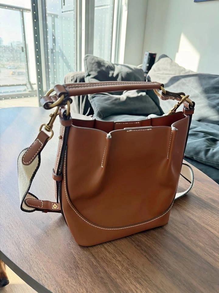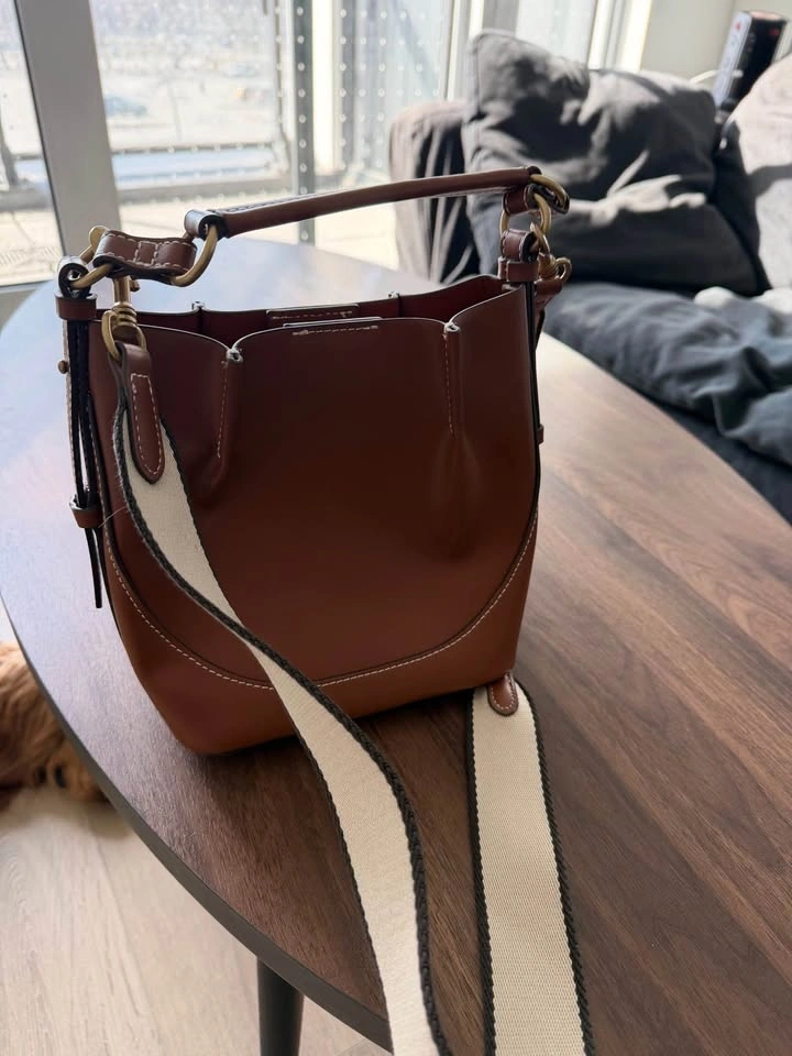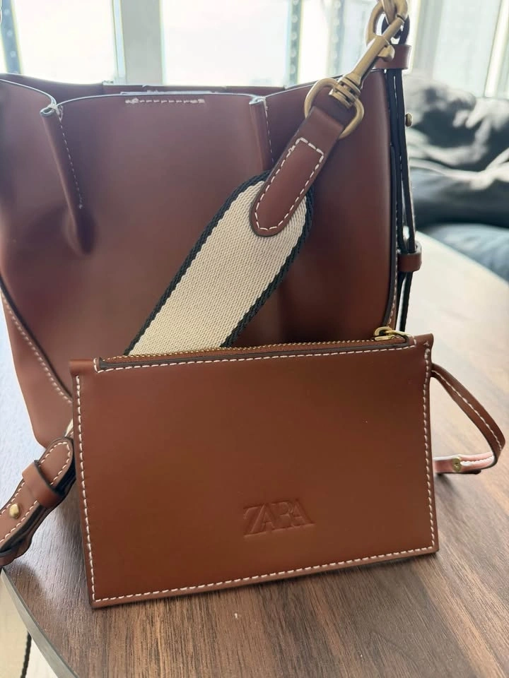 Selling this gorgeous Zara bucket bag in a rich tan/cognac faux leather with contrast white stitching and antique brass hardware. Comes with the matching zip pouch that fits inside the bag and a wide striped canvas crossbody strap. Super versatile — wear it as a top-handle, shoulder, or crossbody bag. Barely used, basically in new condition. Interior is clean with no marks or wear. This is a really elevated-looking bag for the price — gets tons of compliments.