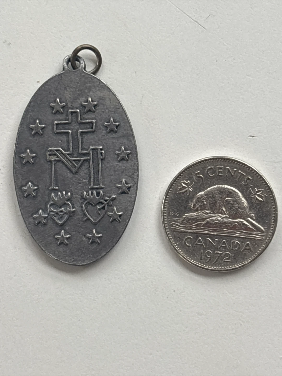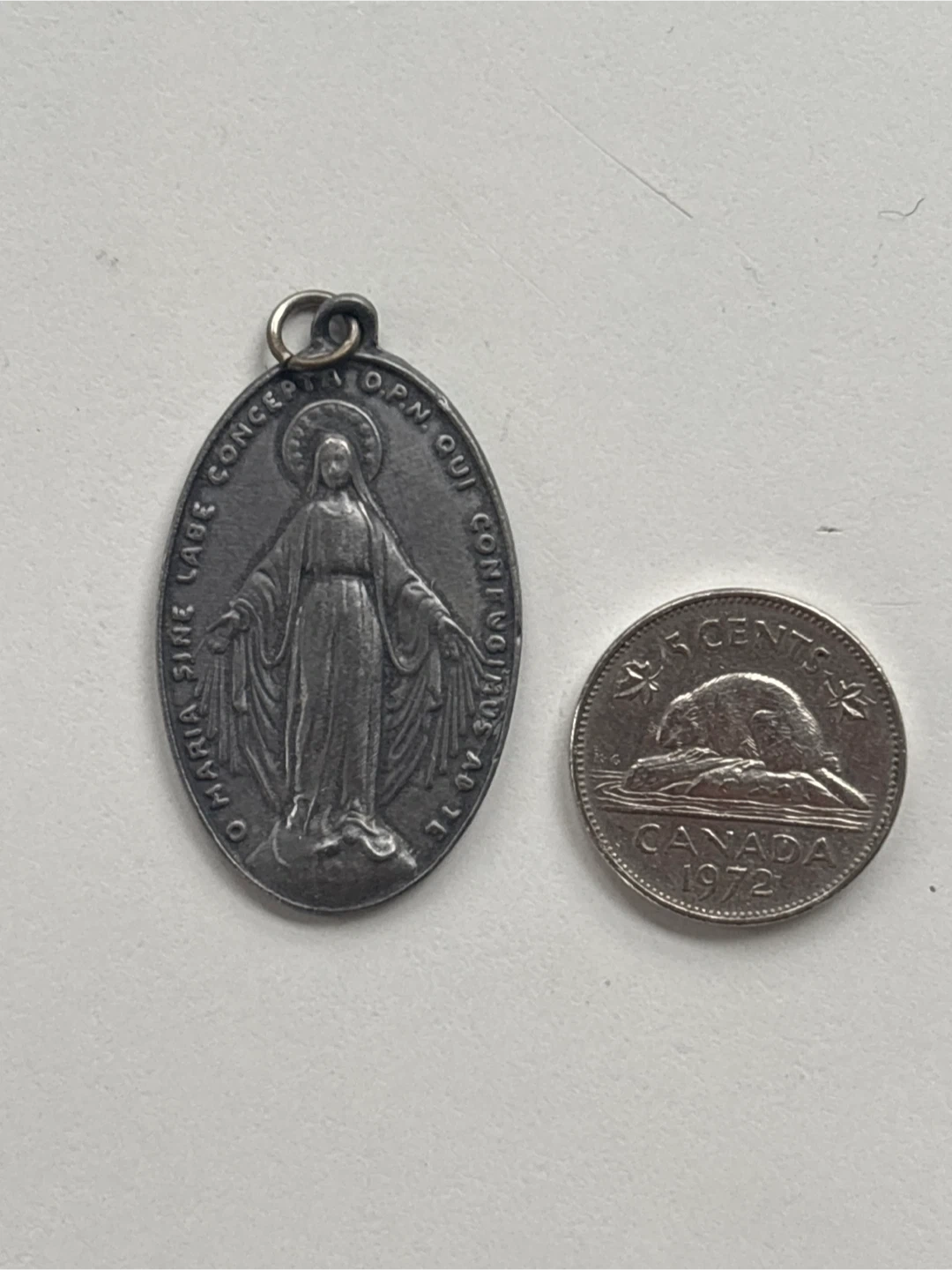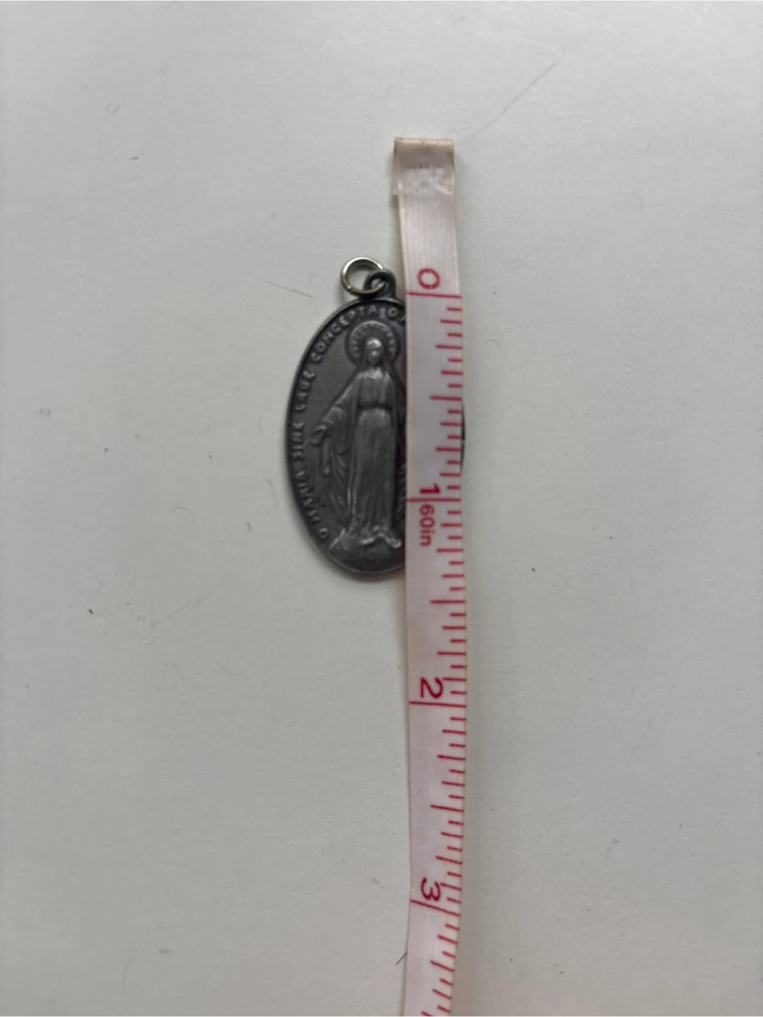 This is a silver-toned Miraculous Medal pendant. It features the Virgin Mary on one side and religious symbols on the other. Approximately 1.5 inches long.