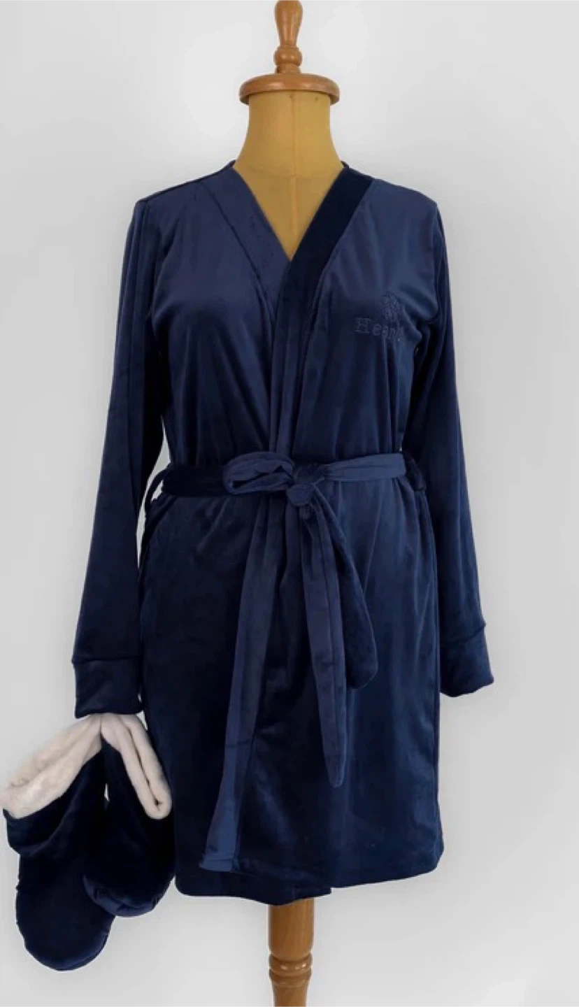 Here's a comfy navy blue robe with matching slippers! The robe features a tie waist and a soft, plush feel. Perfect for lounging around the house on a chilly evening