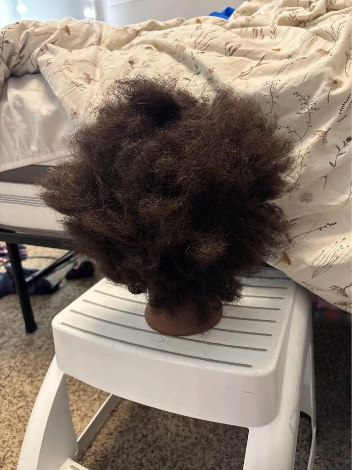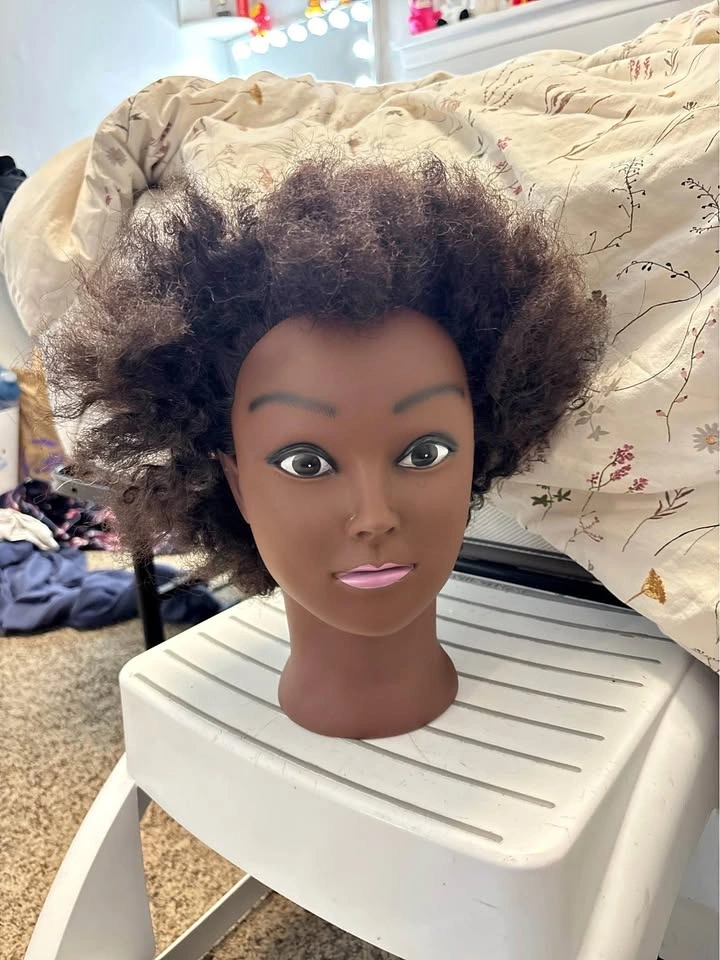 100% real human hair mannequin head, 8 inch hair strands, black color. Handmade, no smell, safe for health and environment. Hair has been washed and disinfected. Do not use hot water when washing for the first time. Blow dry from bottom to top at moderate temperature. The curl will not disappear after washing and will stay well. This afro kinky style is permed with small ring curls, and after washing, it looks more kinky. Great for practicing straightening, coloring, cutting, styling, braiding, setting, and blow waving. Suitable for hairdressers, stylists, cosmetologists, barber shops, and cosmetology students for practicing braiding, styling, coloring, bleaching, dyeing, curling, cutting, updos, and state board exams. Can also be a special gift.