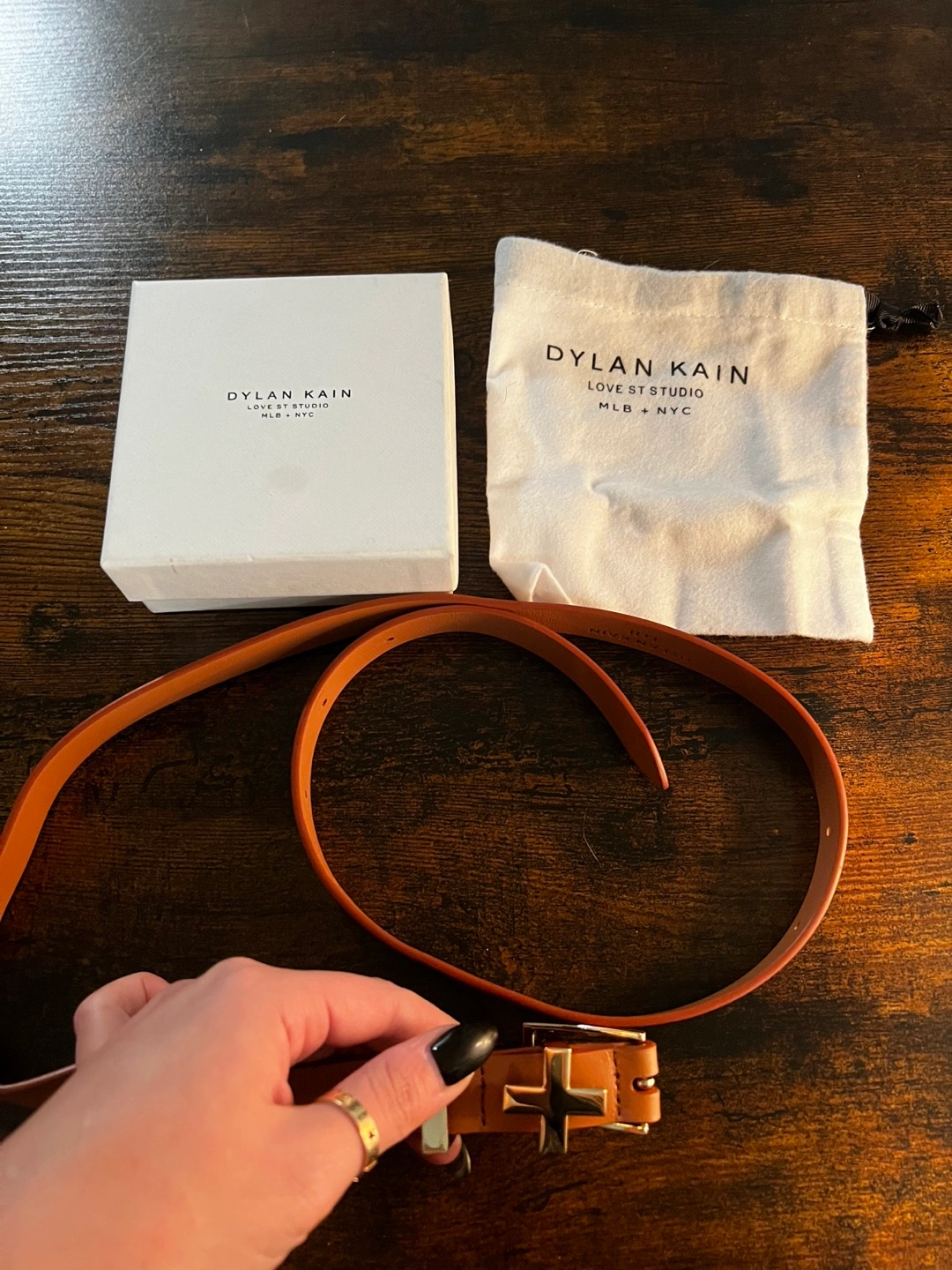 Selling a Dylan Kain belt from the Love St Studio collection! It's a beautiful light brown genuine leather belt with gold hardware in excellent condition. Comes with the original box and dust bag.