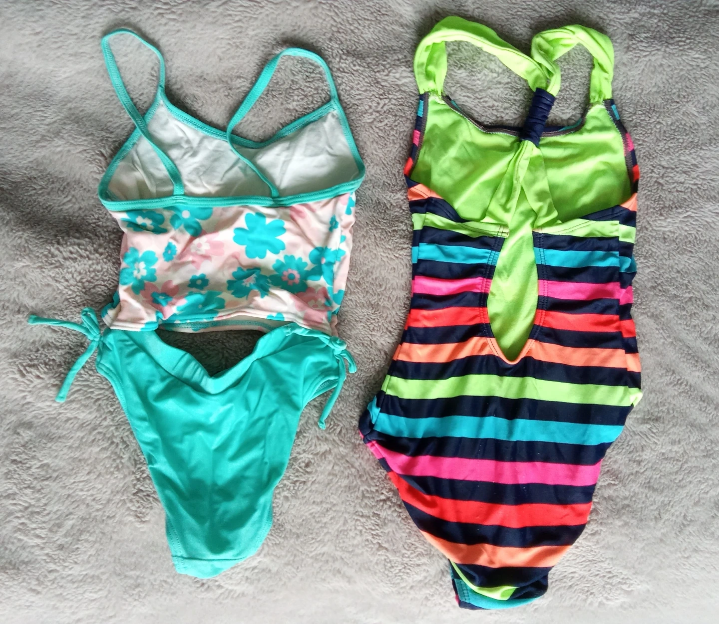 Two adorable swimsuits for your little one. One is a turquoise two-piece with a floral tankini top and tie sides. The other is a colourful striped one-piece with a cutout back. Perfect for a day at the beach or pool!