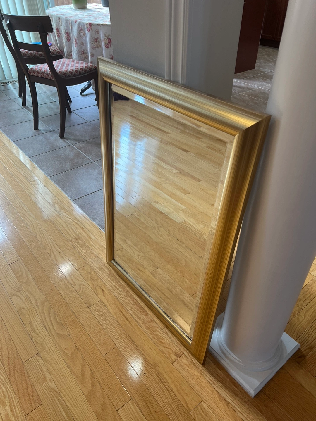 Gold framed mirror with a simple design. It is in good condition with no visible scratches or damage. Can hang on wall or place on ground/table tops.